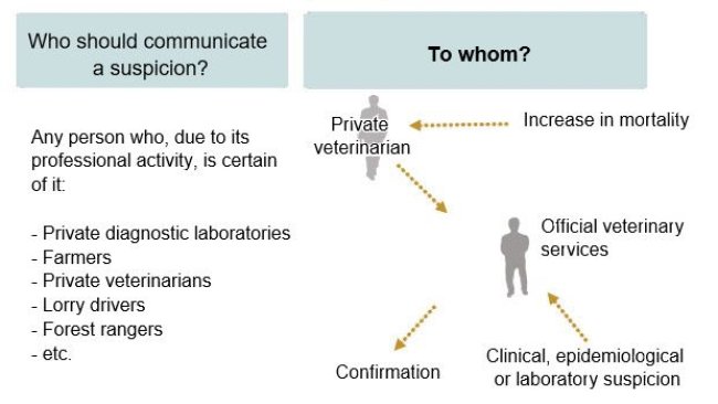African swine fever is a severe viral disease of pigs of all ages. In recent years it has devastated the swine industry in many different countries. ASF actually spreads rather slowly and it is possible to curtail its geographic spread by appropriate action. Early definitive diagnosis is a key element to avoid spread. An initial field diagnosis of African swine fever can be made from clinical signs and necropsy findings.