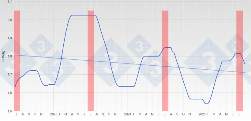 Although Germany lost its position as the European leader in pig slaughter a few years ago (to Spain), it still holds a prominent position in Northern Europe, influencing neighboring markets through extensive trade in both live pigs and pork. In other words, the German price pulls those of its neighbors along.