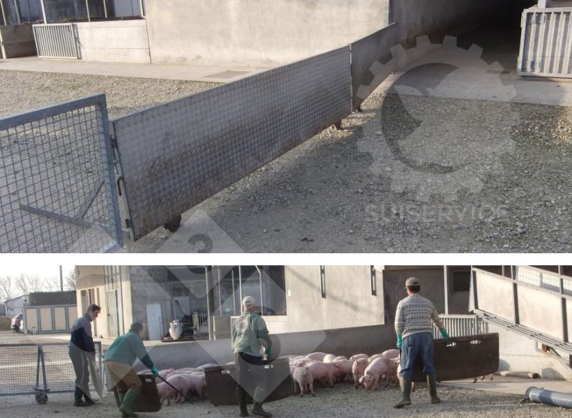 When animals are moved within the barn, the corridors allow the animals to be directed, whereas when animals are moved between two different buildings, specially designed panels or barriers are needed to direct the pigs.