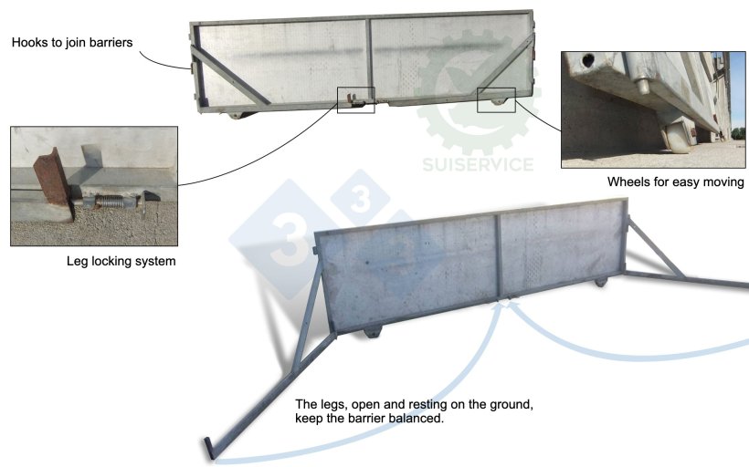 - It is designed to be connected to other similar barriers to create a long fence wall between two buildings.