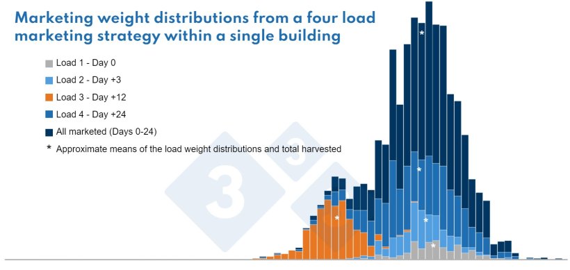 When comparing the different colored weight distributions of the marketing loads, notice that all the groups except the orange-colored distribution seem to have achieved a similar mean sale weight by the time of their marketing but also note how the total weight variation grows for those groups each time they are given extra time to achieve the goal weight. As this happens the mean becomes a potentially deceptive single descriptor for the group or subgroup. Observe how much wider the distributions become as their total days are extended.
