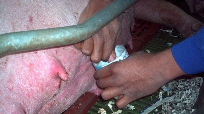 As for the question of injections, our management protocols continue to evolve. We traditionally give intramuscular injections into the sow’s neck and, while not unduly painful, the sow will see it coming and will object strongly. Simply moving the injection site to the pelvic region will effectively eliminate this objection, while moving the injection site to the vulva allows for faster and lower injection volumes (photo 1). Most recently, the development of a PGF tablet for vaginal deposition removes the need for any injection.