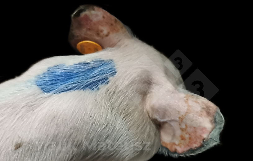 Nonetheless, we should not overlook the relatively rare cases of ear lesions seen in severely ill piglets, which may be associated with impaired blood circulation or underlying skin infections and might need more research attention.