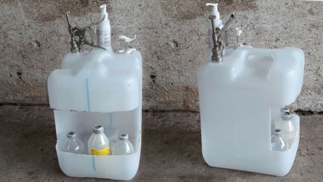 Three plastic tubes are attached with clamps to the bucket, which serve as compartments for three different syringes that can be used for different antibiotic or anti-inflammatory treatments. The tube length is calculated according to the length of the syringe, including the needle, so that when it is placed inside, the needle does not touch the bottom and therefore does not get damaged, although it is always best to remove the needle after each treatment. The external hooks allow it to hang from the pen dividers at a comfortable height.