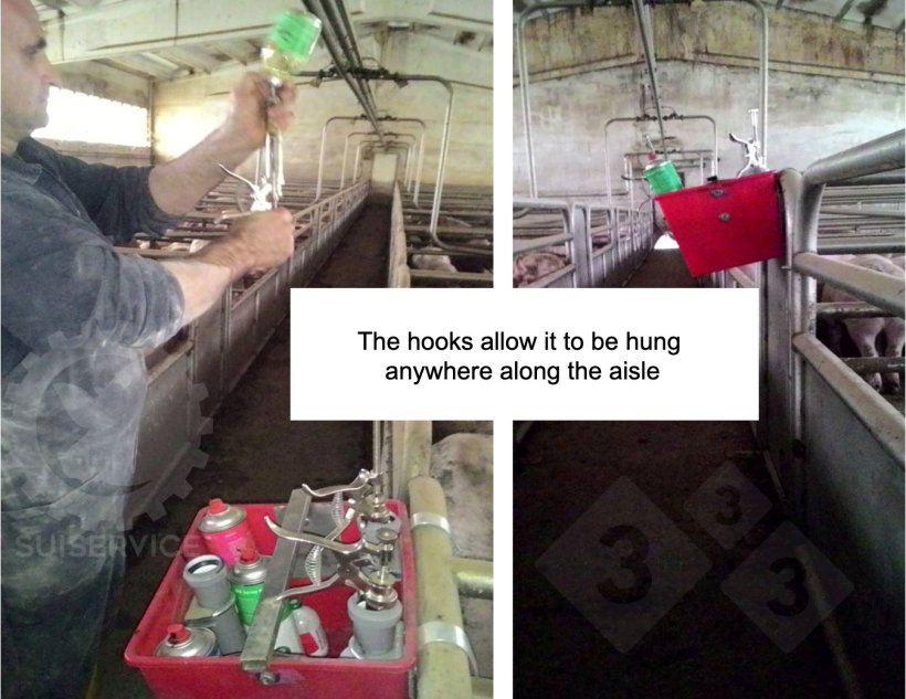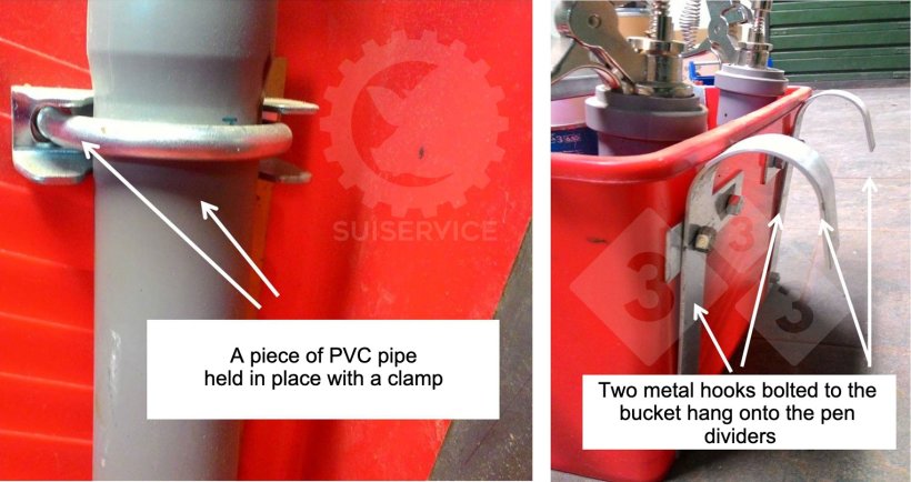 Three plastic tubes are attached with clamps to the bucket, which serve as compartments for three different syringes that can be used for different antibiotic or anti-inflammatory treatments. The tube length is calculated according to the length of the syringe, including the needle, so that when it is placed inside, the needle does not touch the bottom and therefore does not get damaged, although it is always best to remove the needle after each treatment. The external hooks allow it to hang from the pen dividers at a comfortable height.