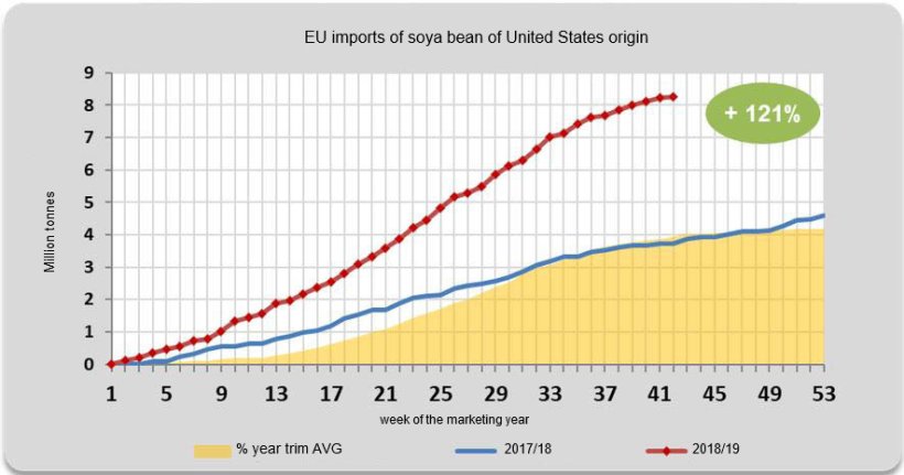 - Compared to the first 42 weeks of the 2017/2018 marketing year (from July to mid-April), in the current market year EU imports of soya beans from the U.S. are up by 121% at 8,244,594 tonnes;