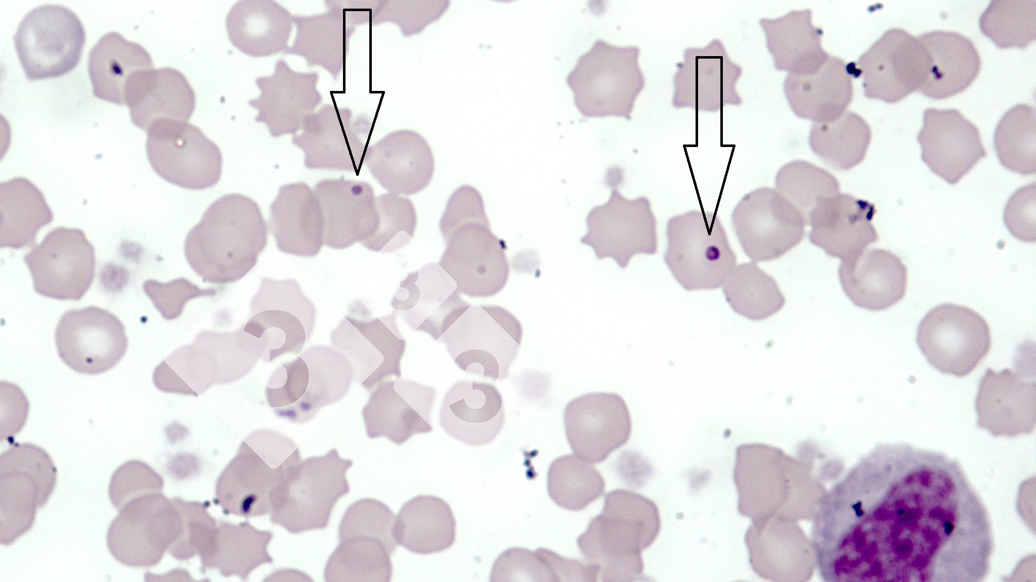This is anaemia due to the small bacterium Mycoplasma suis (previously known as Eperythrozoon). Affected gilts appear dull, thin and pale with a low colostrum and milk yield. Anaemia in pigs may be confirmed by examination of the areas inside the sclera inside the eyelids, which are pale and white. Thin smears of blood films can be fixed in methanol and stained by routine blood stains, such as the Giemsa stain to search for the small Mycoplasma suis. Typically in Mycoplasma suis infections, the red cell counts are very low, such as 4.2 to 5.5 x 106 cells per mm3 of blood, compared to a suggested normal range of 5.6 to 9.5 x 106 cells per mm3. This disease occurs sporadically in groups of pigs, where needles and syringes and farm equipment are shared among different pigs. This may act to spread the infection from one infected group of pigs to another, such as from old to new breeding pigs.