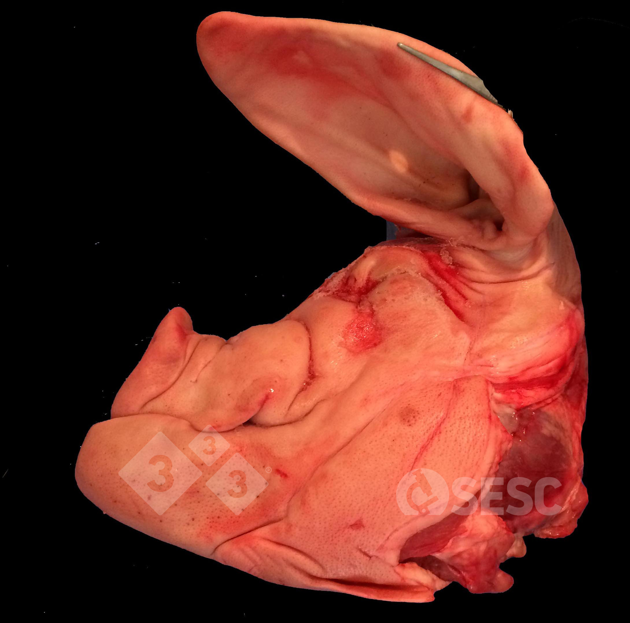 A shortening of the maxillary bone (Brachygnathia superior) can be observed in this pig’s head secondary to atrophy and deviation of nasal turbinates. This disease is called atrophic rhinitis, a multifactorial disease caused by either dermonecrotoxin positive Pasteurella multocida (Progressive atrophic rhinitis) or Bordetella bronchiseptica (Nonprogressive atrophic rhinitis). Poor air quality is a predisposing factor.