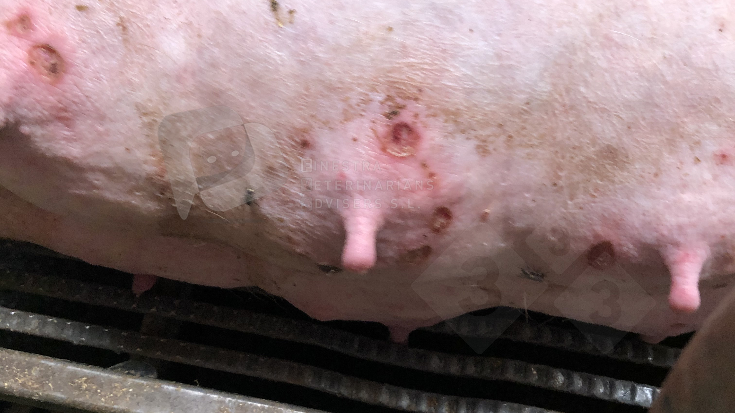 Bites on the sow's mammary gland. Lesions normally caused by laceration from the piglets' teeth when suckling. This does not occur in all litters, but when it does appear it is necessary to cut or file the piglets' teeth. Such a lesion can end up developing dermal abscesses and pyrogranulomatous lesions, in many cases caused by A. pyogenes and S. aureus. Mastitis can cause dysgalactia in the injured mammary glands; therefore, it can affect weight gain and immune status in the piglets, which in turn can lead to lower economic gains for the farm.