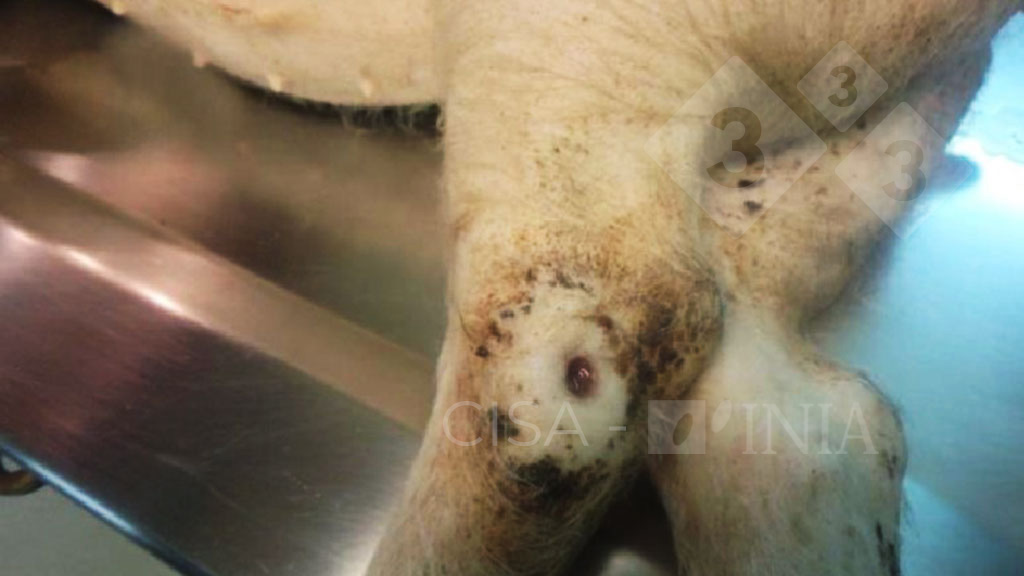 Chronic skin ulcers at hind legs - Atlas of swine pathology