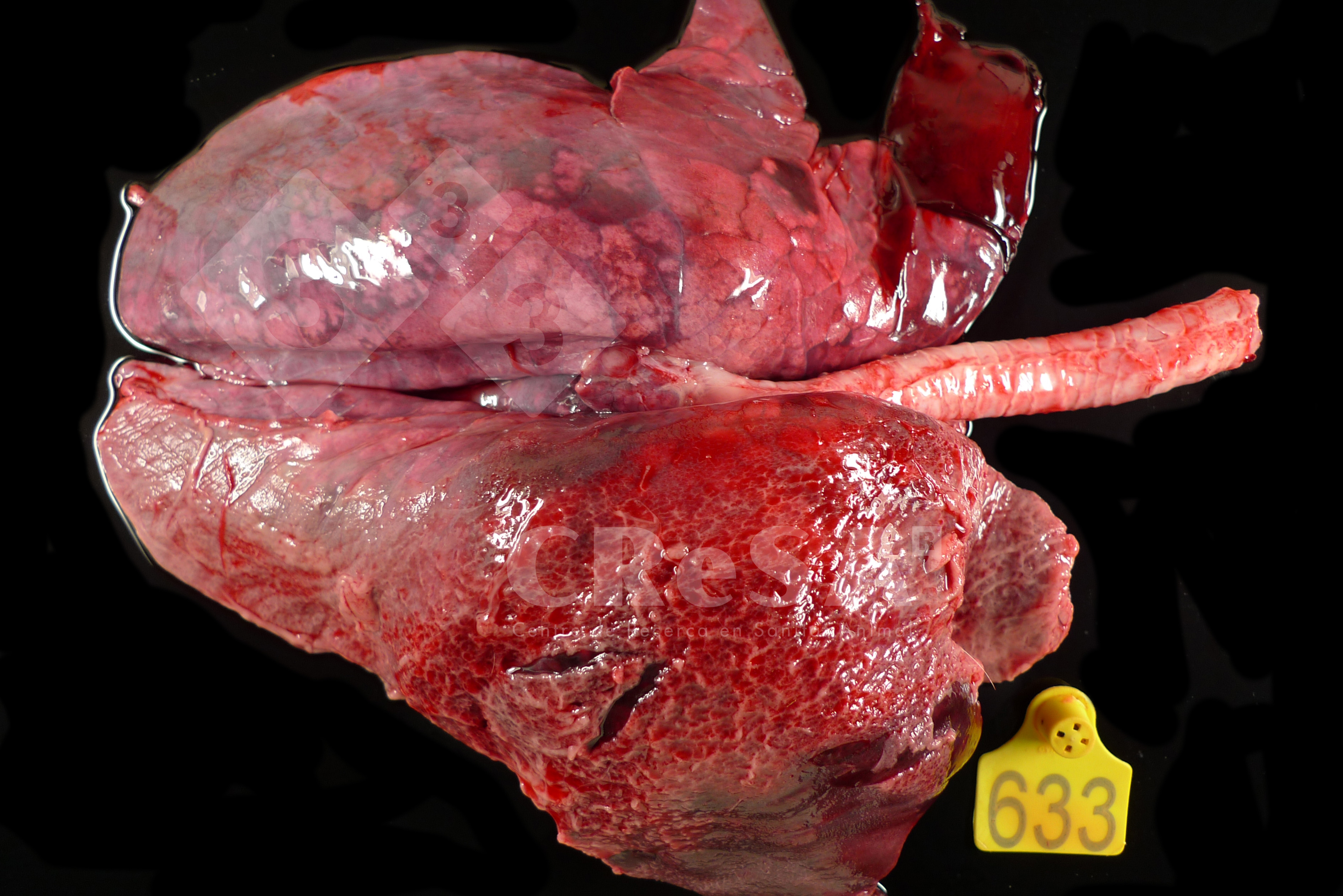 Contagious pleuropneumonia is produced by Actinobacillus pleuropneumoniae. This bacterium usually produces a unilateral and large focus of necrosis in the lung with hemorrhages and fibrin. Because of that, this lesion is usually called fibrinous-necrotizing, or necrotizing-hemorrhagic pleuropneumonia.