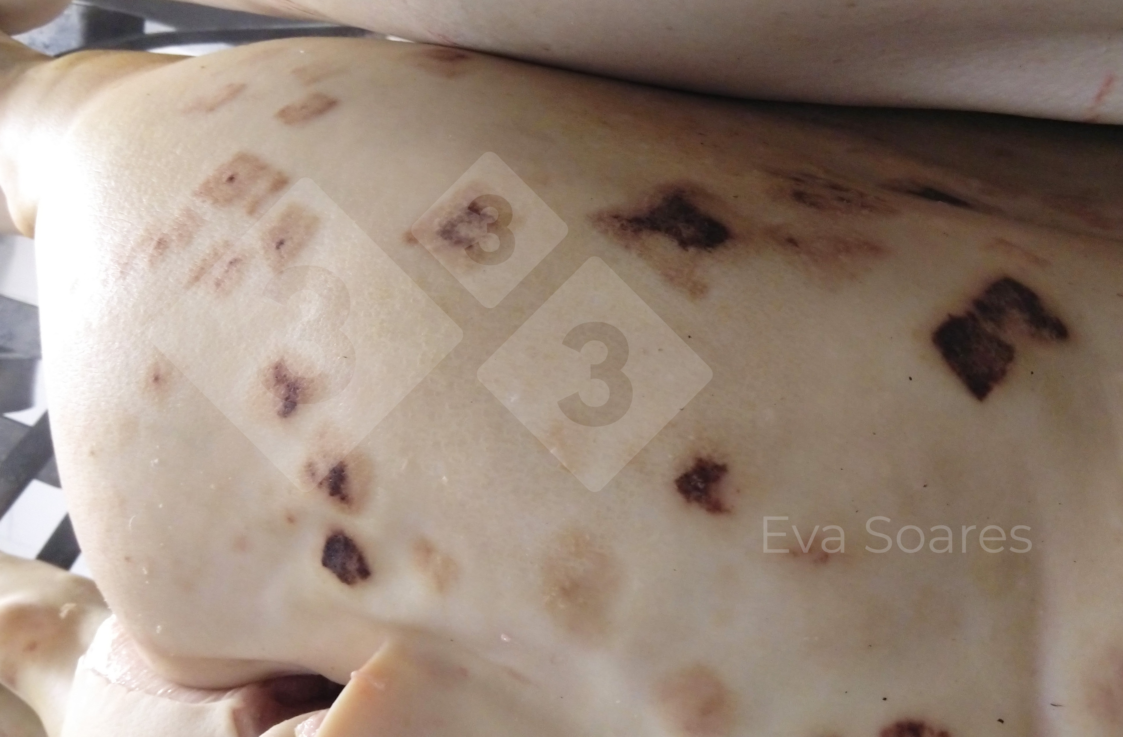 Skin lesions found on a fattening pig at an abattoir. They are the typical cutaneous lesions of erysipelas, caused by the bacterium Erysipelothrix rhusiopathiae. The clinical picture is characterised by the emergence of small, raised and rhomboidal (diamond-shaped) red areas (erythema) and oedema on the skin that can become necrotic in their central area, giving place to crusting. The tips of the ears and the tail can also become necrotic.