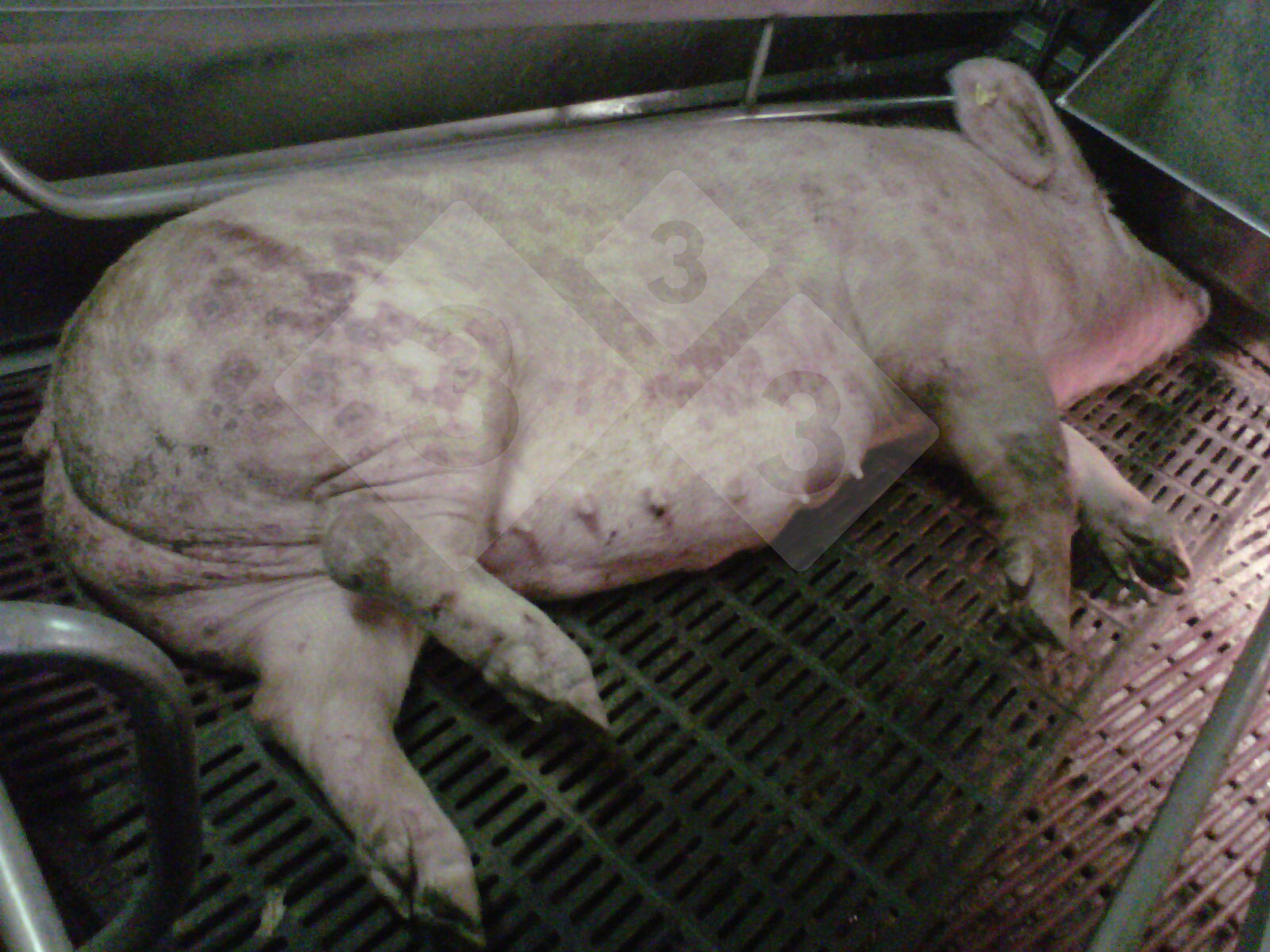Lesions caused by Erysipelothrix rhusiopathiae in a case of erysipelas. The cutaneous form of the disease is usually associated with acute episodes, with very characteristic diamond-shaped (rhomboidal) lesions spread throughout the body. Despite having been vaccinated, this sow showed clinical disease, with high fever and abortion. Sows and fattening pigs are the most sensitive population on farms.