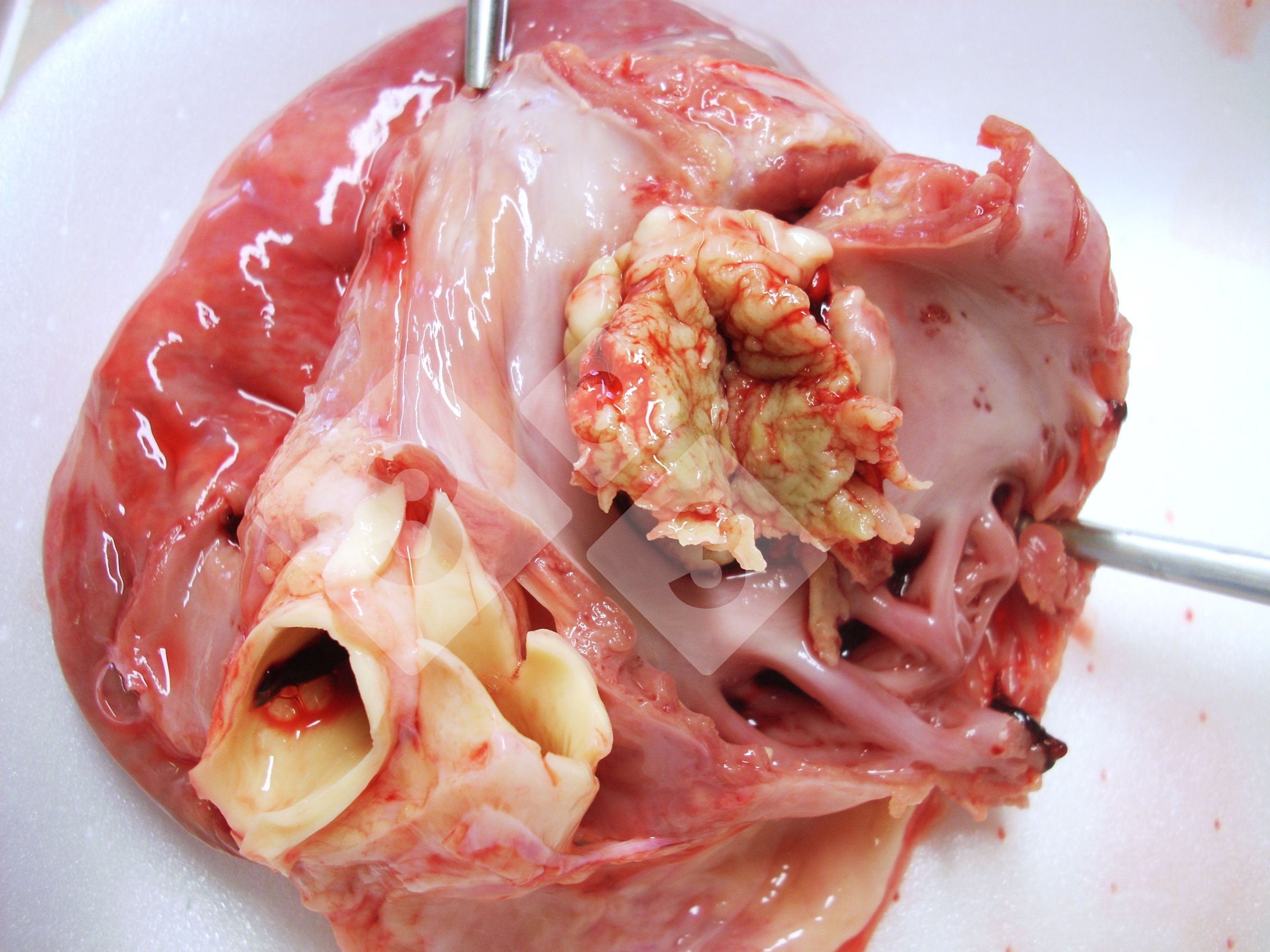 The endocarditis observed in this weaning piglet was caused by Streptococcus suis. In this case, piglets affected during the weaning stage showed high fever, neurological symptoms and joint swelling. This lesion in the endocardium was found during necropsy of one of the pigs. The material sent to the laboratory identified the causative agent, which mostly affects very young animals —often during weaning—, increasing mortality. The agent affects the serous membrane, so lesions can be seen in the endocardium, pericardium, joints serous membrane, meninges, etc. Mixing piglets at weaning generates healthy carrier pigs.