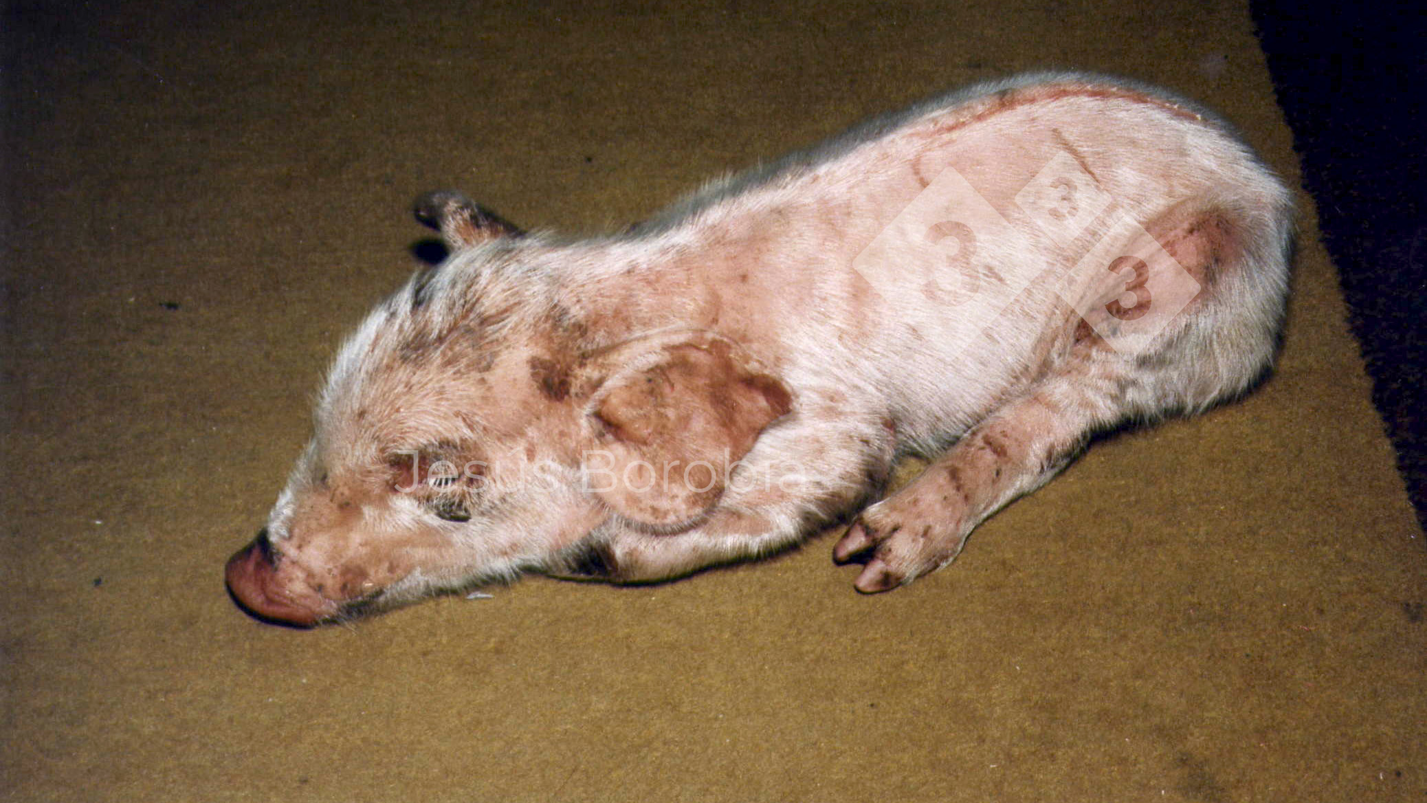 Thick, wrinkled and greasy skin with dark areas is highly suggestive of exudative epidermitis (greasy pig disease). It is caused by Staphylococcus hyicus which invades abraded skin causing infection.