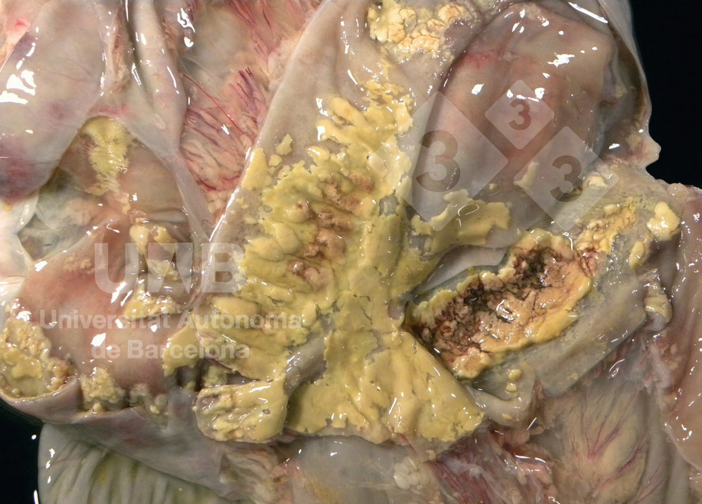 Fibrinous exudation in the small intestine and colon are usually associated with Salmonella spp. infection (as it is this case). Swine dysentery (caused by Brachyspira hyodysenteriae) can also produce fibrinous or ulcerative lesions, but usually restricted to colon. Fibrin adhered to the mucosa surface implies necrosis of the mucosa.
