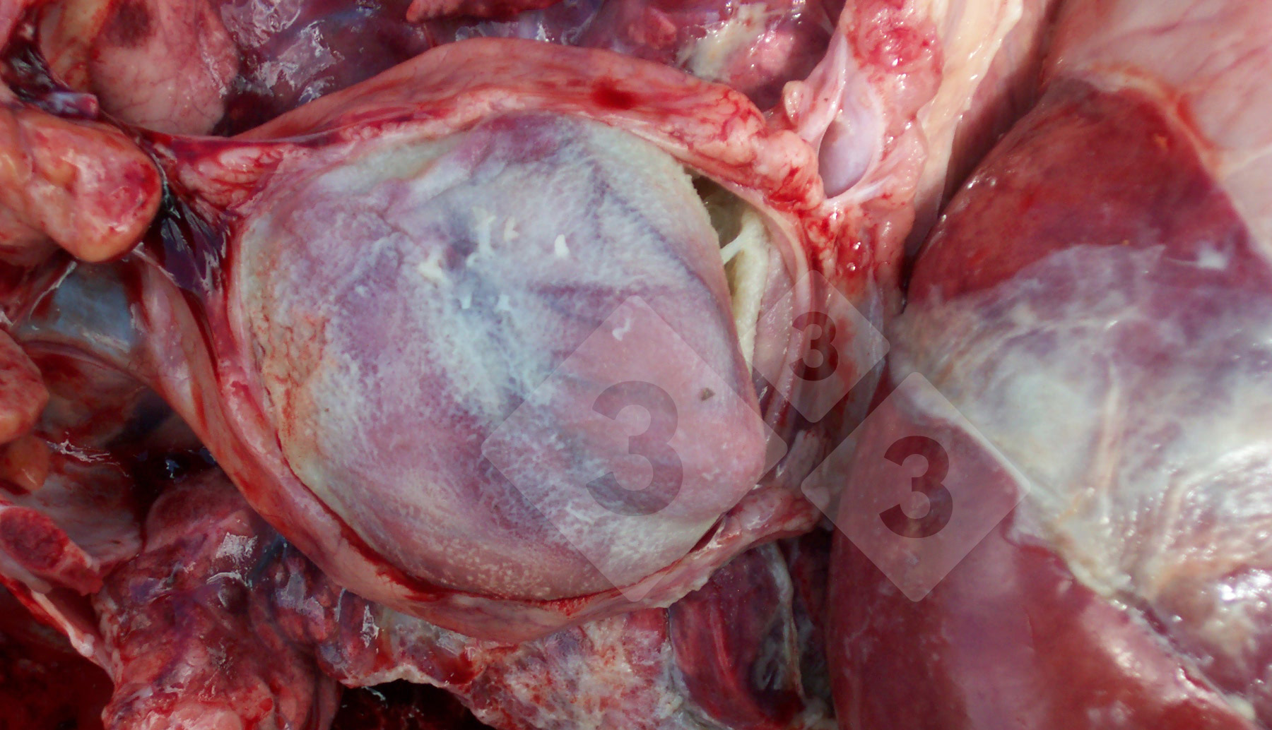 The autopsy signs are consistent with pericarditis and diffuse serositis in pigs caused by the bacterium Haemophilus parasuis. This common disease is also known as Glasser’s disease. The hospital pens of the nursery area may contain many runted, sick and dull pigs, without a clear pattern of diarrhoea or coughing. At autopsy, a dull pale thickening in patchy strands and sheets across the serosal linings of the lungs, heart and abdominal organs is noted. In severely affected pigs, this patchy grey-yellow thickening is thicker and can resemble two pieces of bread and butter stuck together. The bacteriology laboratory may have difficulty at culturing this bacterium from fresh samples. Piglets in stable H parasuis herds are usually infected within a few days of birth from their mother and develop a sub-clinical infection and acquire protective immunity. However, where piglets are mixed with piglets from other breeder pig groups, which may have different strains of H parasuis, then piglets will lack appropriate maternal antibody and develop Glasser’s disease. Use of in-feed antibiotic therapy to control this disease in weaner pigs is currently an essential part of pig raising. This form of control has the advantages of not requiring detailed knowledge of maternal antibody status, nor of the dominant strains of H parasuis present on the affected farm. Other causes of fibrinous pericarditis may include Streptococcus suis, Mycoplasma hyopneumoniae, Mycoplasma hyorhinis.