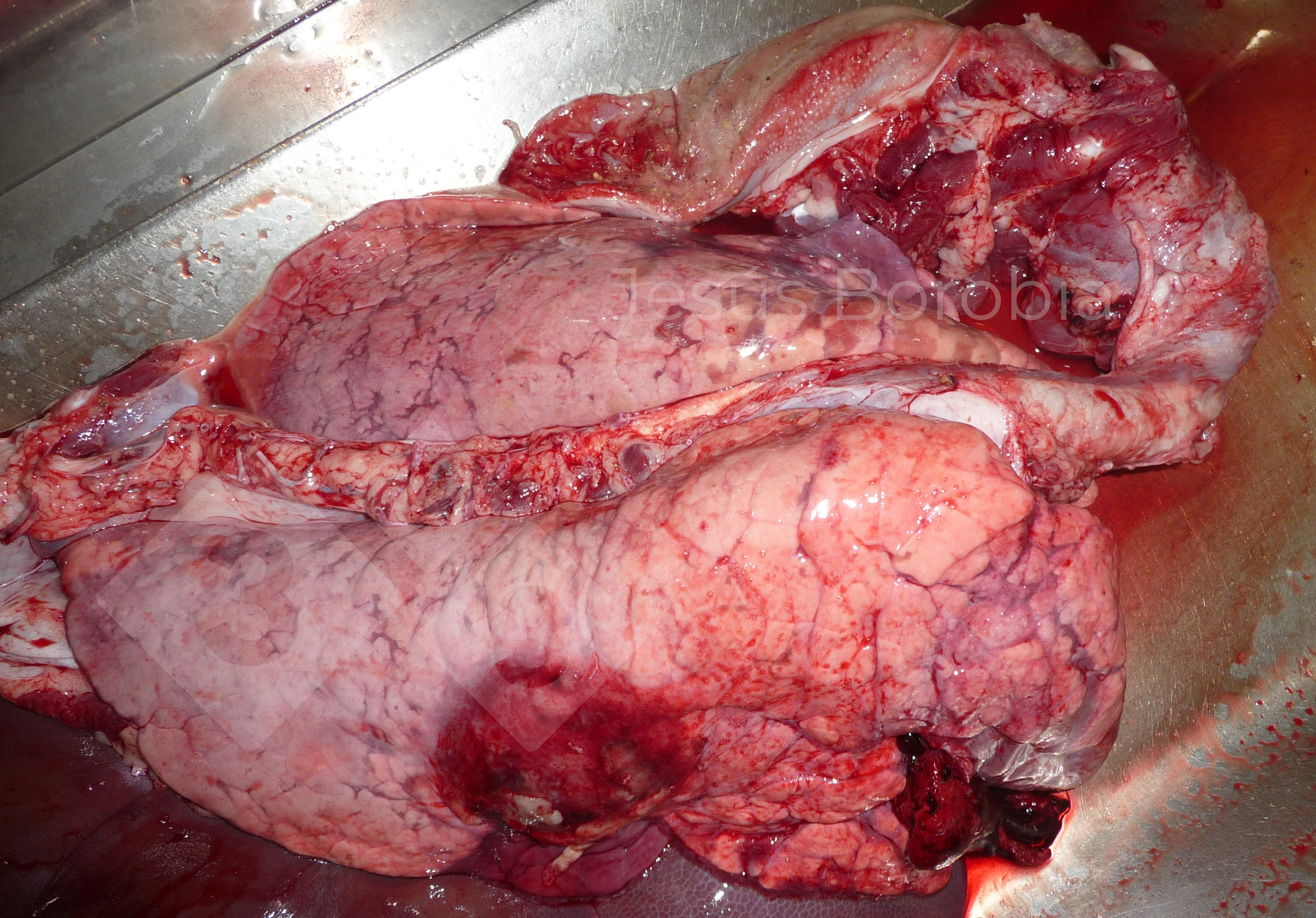 These lungs with fibronecrotic pleuropneumonia lesions belong to a pig in a growing/finishing unit suffering a respiratory disease outbreak with sudden deaths. Some of the dead pigs had fibronecrotic pleuropneumonia, pleurisy and pericarditis. Actinobacillus pleuropneumoniae serotype 8 was detected in these lungs.