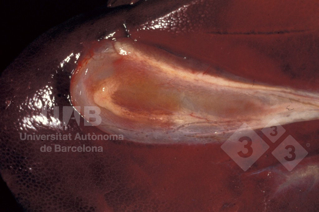 This is edema of the gallbladder wall. It is usually related with Oedema disease (Enterotoxemic colibacillosis), but other diseases such as Hepatosis dietetica can be included in the differential diagnosis.