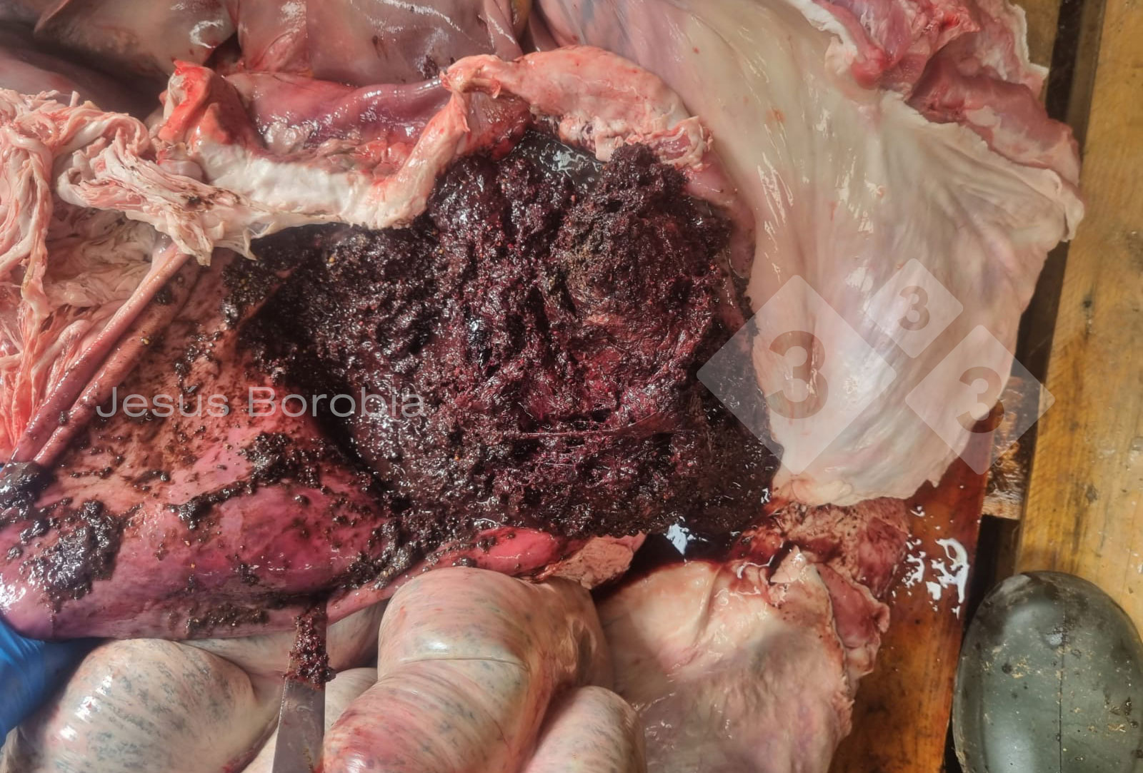 This image corresponds to a stomach filled with digested blood caused by a gastric ulceration of the pars oesophagea in a sow that was found dead in the pen.
