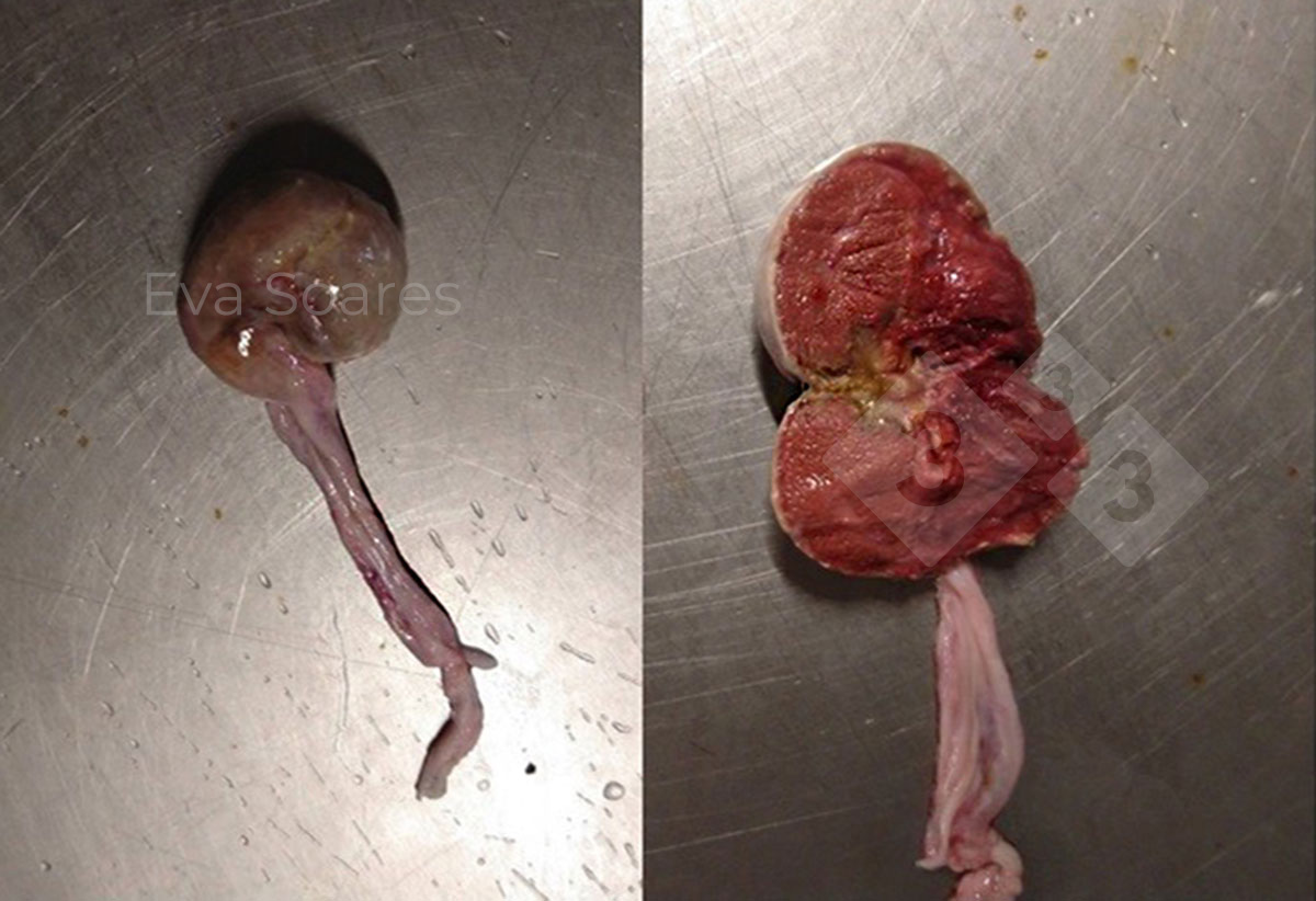 Hermaphroditism is a pathology of genetic origin in which sexual organs have characteristics of both sexes. A routine inspection at the slaughterhouse found that the genital tract of a fattening female pig, particularly the uterus and vagina, were atretic. Two testicular globular masses (image) could be seen in the ovarian insertion area. After its incision, it was confirmed that the internal structure was similar to that of normal testicles just only a slightly redder .