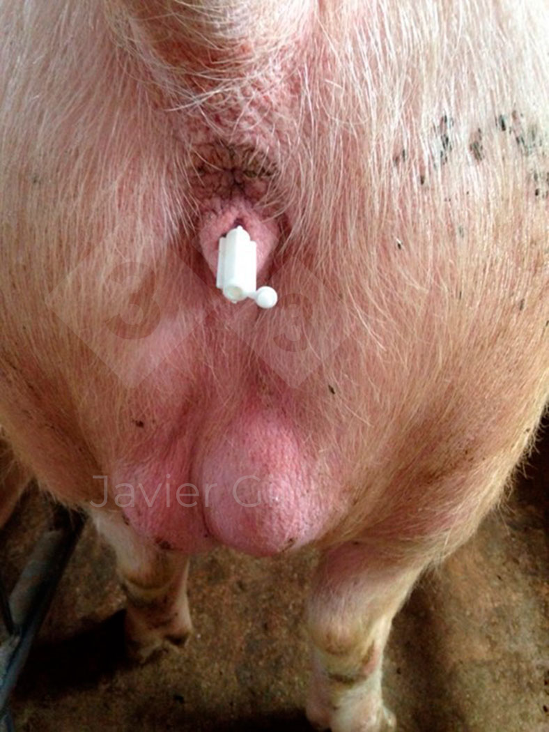 A hermaphrodite teaser boar has testicles and a vulva that connects to a vagina that allows for the placement of a conventional AI catheter.