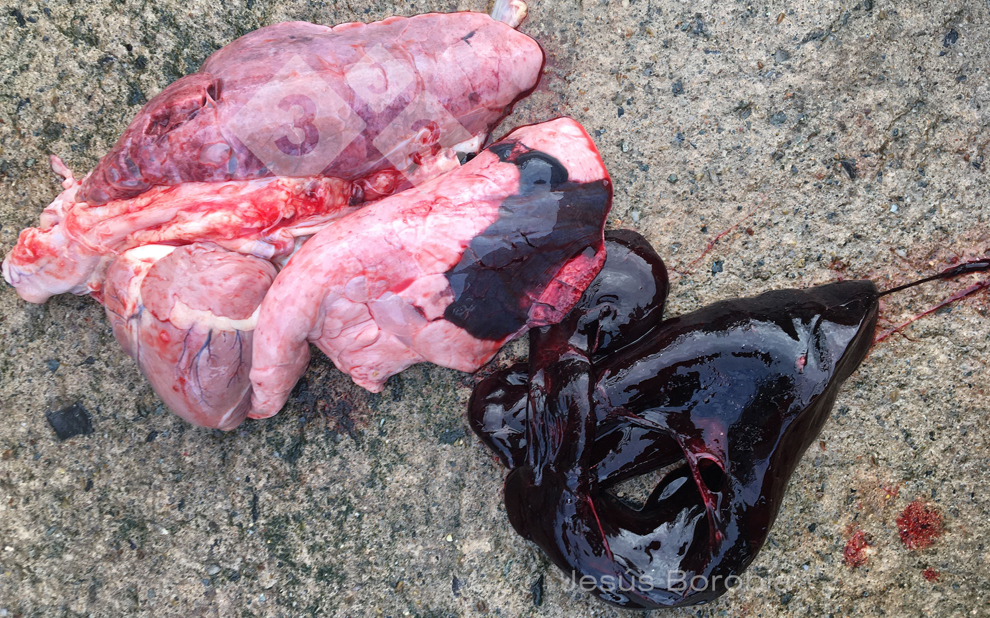 This image shows a congestion of the left diaphragmactic pulmonary lobe with a blood clot in the thoracic cavity. There are many possible causes of pulmonary haemorrhage. Infection is a common cause. However, it is not always possible to identify the cause. Where no cause can be found, this is called idiopathic pulmonary haemorrhage, as in this case.