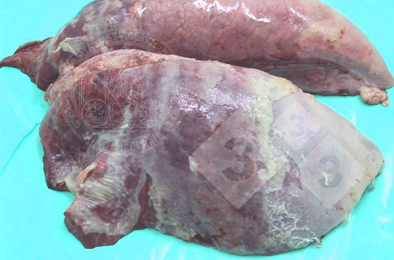 Fattening pig lung that has not collapsed when taking it out from the thoracic cavity and that shows cranioventral consolidated areas with a dark red colour and fibrin deposits in the pleura that cover almost all the surface. It is a coinfection with a respiratory virus (PRRS virus) and a bacterium (Pasteurella multocida). There is a combination of an interstitial pneumonia (virus) and a fibrinous bronchopneumonia (bacterium).