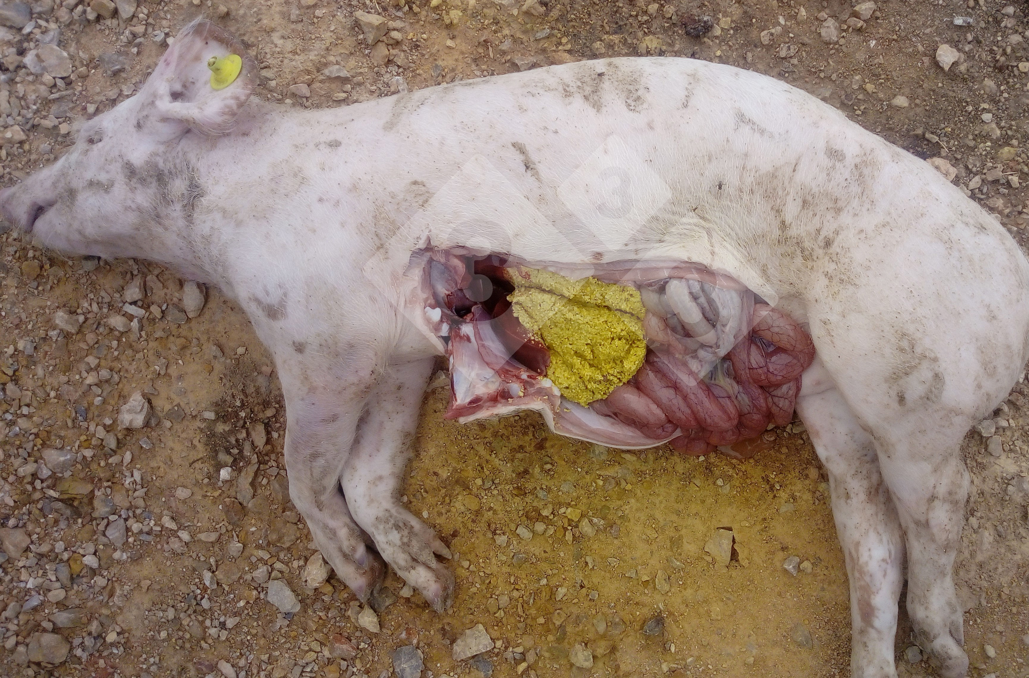 Sudden deaths at the beginning of the fattening stage. No fever, and feed intake is maintained. Animals found with sunken eyes, a sign of dehydration. Some sudden deaths due to toxemia. Stomach appears full of feed, since death is caused by toxemia and there is no fever. The intestine shows high level of congestion of the serosa. Very watery bowel content.