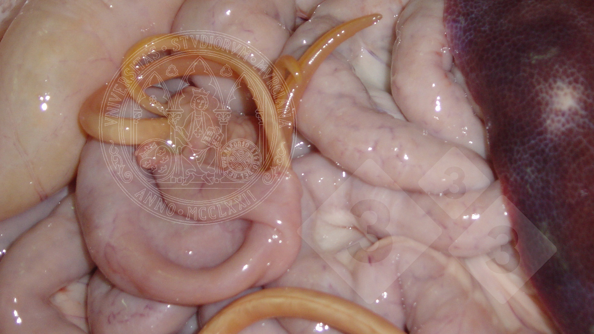 The photo shows the small intestine of a pig slaughtered in an abattoir whose wall had a very hard consistency at some places. We can see many whitish spots on the surface of the liver. When opening the gut portions with a hard consistency, several worms appeared, some of them exceeding 20 cm of length. It is Ascaris suum, and the liver spots are called 'milk spots', and they are caused by the migration of this parasite's larvae.