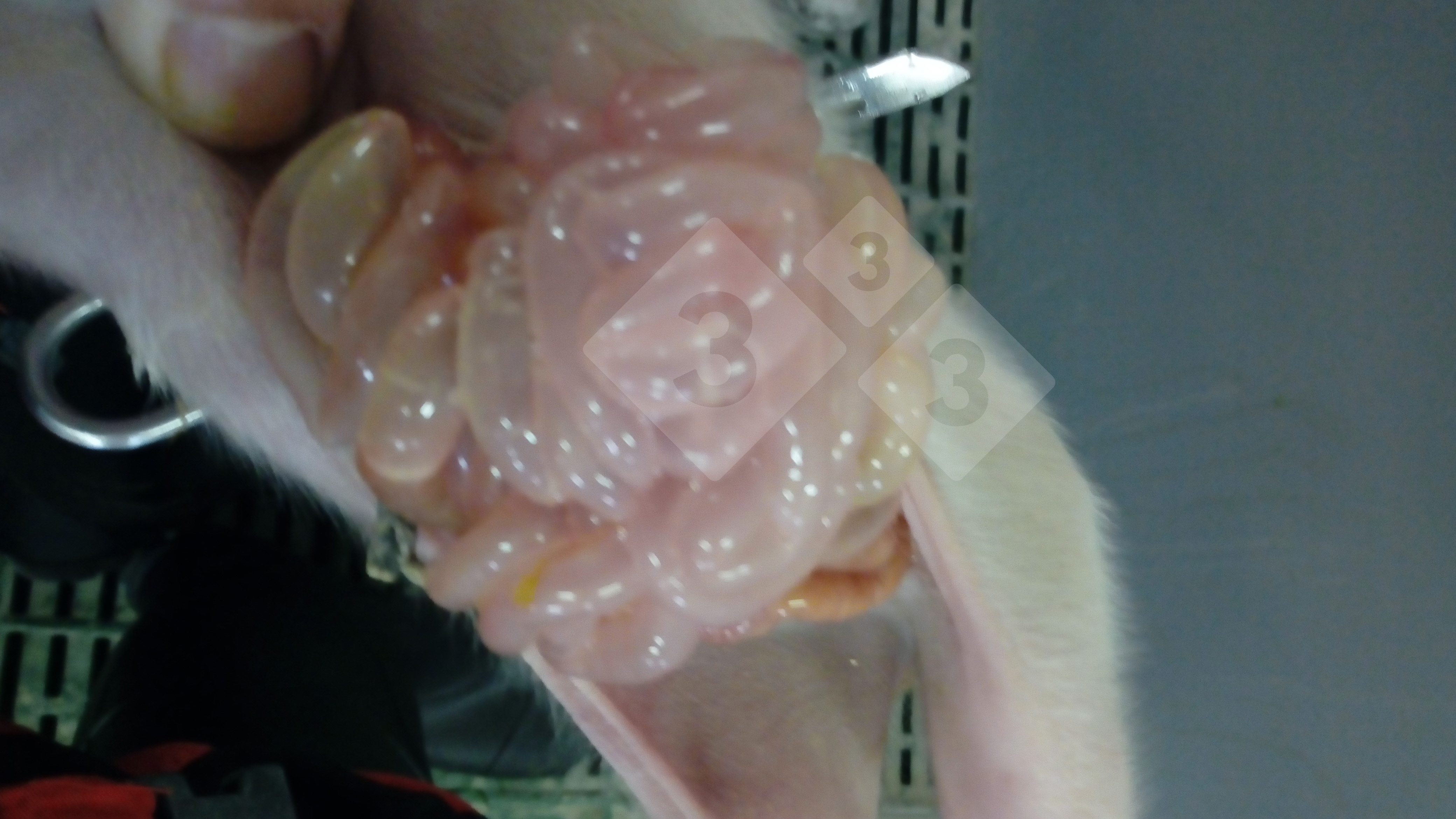 Rotavirus diarrhea. Translucent intestine in nursing piglets caused by the destruction of intestinal villi due to virus replication.