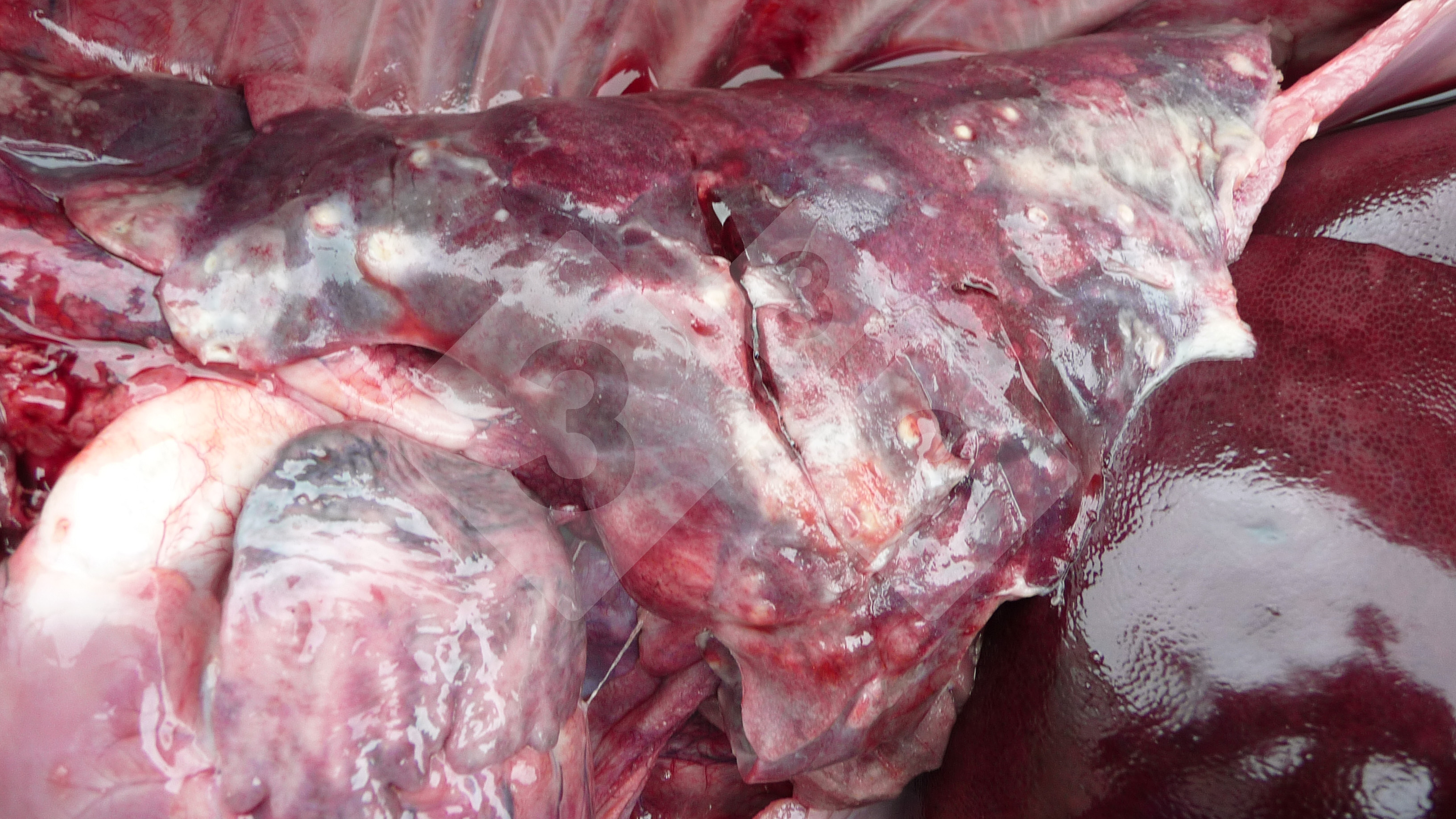 Trueperella pyogenes was isolated from this lung. This bacterium is an opportunistic pathogen causing purulent infections (abscesses) in different parts of the body. The pig was tail bitten earlier but the lesion was healed when the animal died.