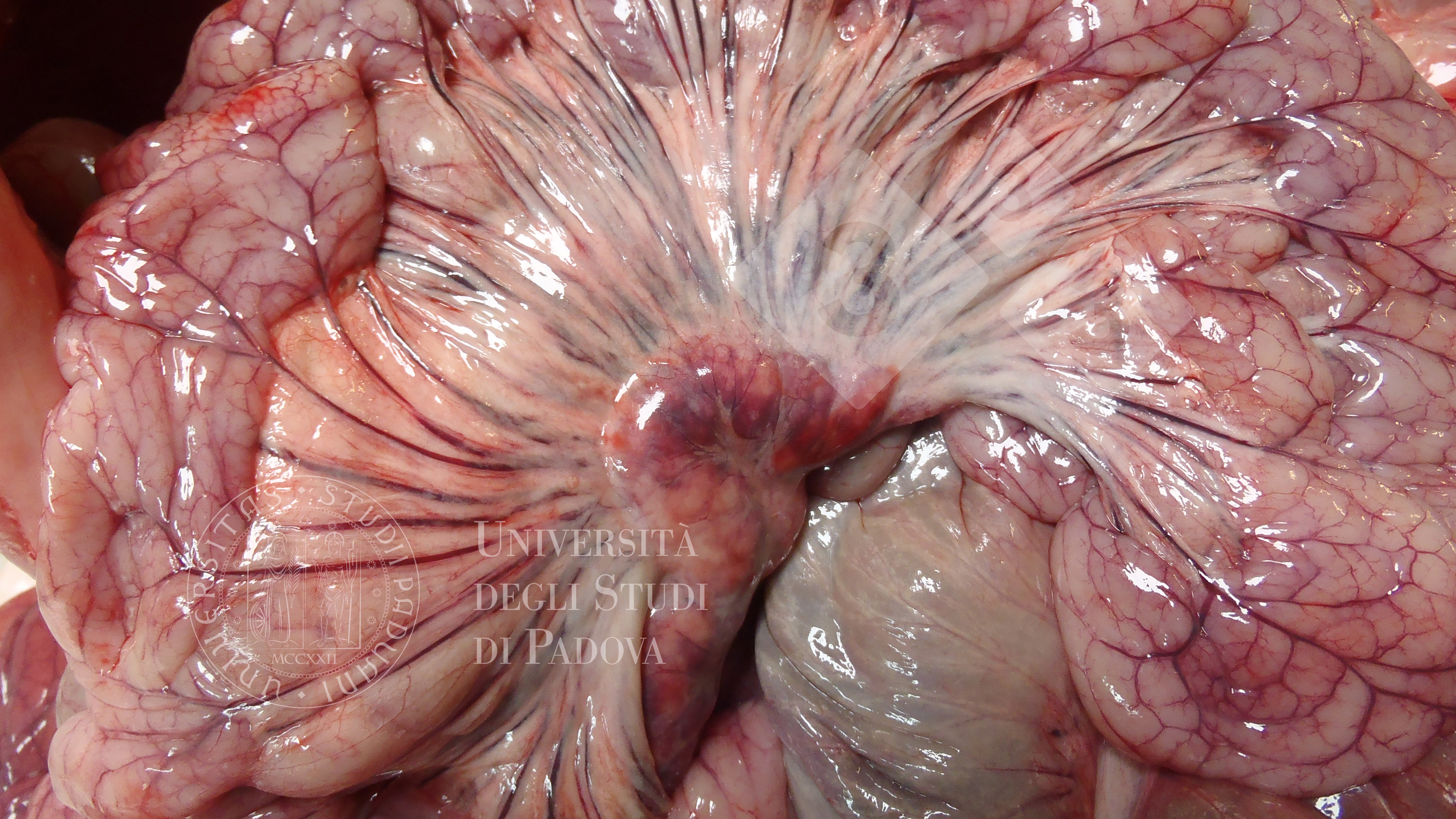 Mesenteric lymph nodes appear diffusely hyperemic and edematous; whitish, raised nodules scattered within the tissue correspond to hyperplastic follicles. Mesenteric and intestinal veins are prominent due to passive congestion. Intestine appears to be flaccide, without gas content. Gross features are consistent with sub-acute mesenteric hyperplastic lymphadenopathy.