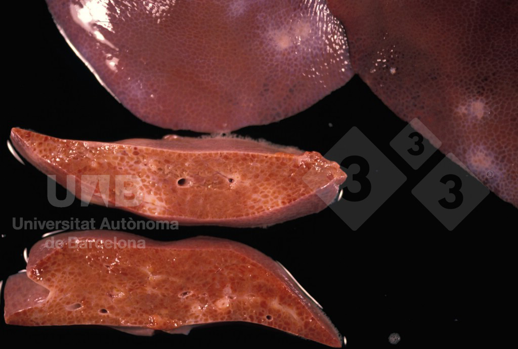 These lesions are due to migration of Ascaris suum larvae trough the liver parenchyma. This migration produces an interstitial inflammation that is replaced by fibrous tissue in the chronic stages. All of this is observed grossly as multifocal whitish areas, usually called “milk spots”.