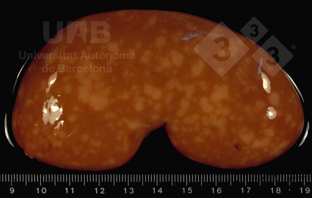 Multifocal interstitial nephritis, also called "white-spotted kidney", corresponds to a chronic and nonsuppurative inflammation of the renal interstitium. The cause is rarely known, but in some cases it has been associated with leptospirosis and porcine circovirus type 2.