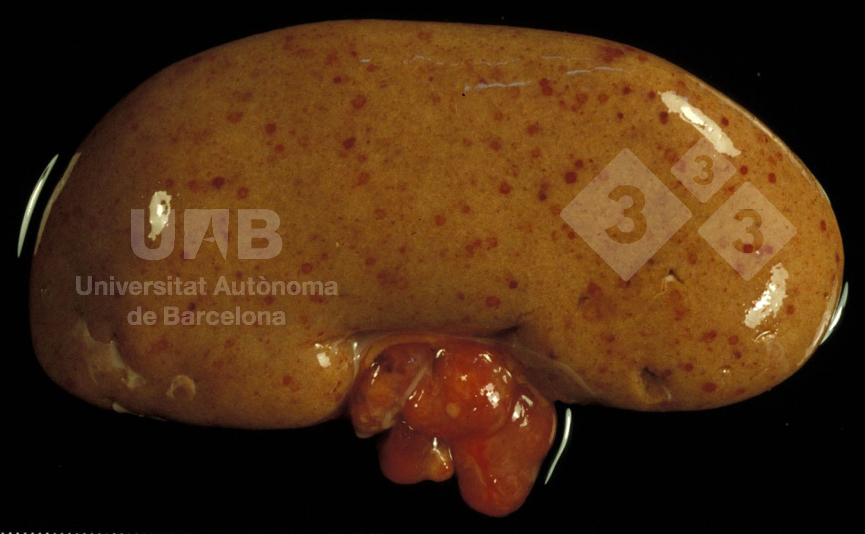 Animals with PDNS have exudative glomerulonephritis and vasculitis in the kidney. This lesion can be observed macroscopically as multifocal red dots. The pathogenesis of this syndrome is associated with immune complexes formation and its deposition on the basal membranes of glomeruli and vascular walls. In some cases necrotizing and crusty dermatitis can be found in these animals. Several infectious etiologies have been related to PDNS, particularly PCV2 and some strains of Pasteurella multocida. Diferential diagnoses include Classical swine fever, African swine fever, Erysipelas and Actinobacillus suis
