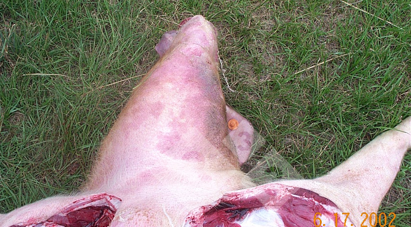 This lesion is the typical presentation in pigs of the ancient animal disease known as anthrax, caused by the large bacterium Bacillus anthracis. Affected pigs are usually older outdoor pigs, which are dull, not eating, with a firm, hot and painful swelling across their throat, neck and lower face. At autopsy, the neck and throat have firm gelatinous oedema fluid, with extensive infiltration of neck and jaw tissues with clear bloody wine-like fluid and gelatinous material. The local lymph nodes are greatly enlarged and oedematous, whereas internal organs including the liver and spleen appear relatively normal. It is important to confirm any suspicious deaths by staining and examination of dry smears of the lymph node and dark fluids in the neck. This smear diagnosis is often difficult in pigs, so it is also important to culture the lymph nodes. Anthrax bacteria occur in the soil only in defined endemic regions, so unless pigs are raised outdoors in those areas, the disease is rare. However, when it is does occur, it is usually a major dramatic episode, because of the strong ability of anthrax to cause public fear in humans. It is often difficult to easily dispose of affected pigs in a practical manner. In general, they should be destroyed on site by incineration.