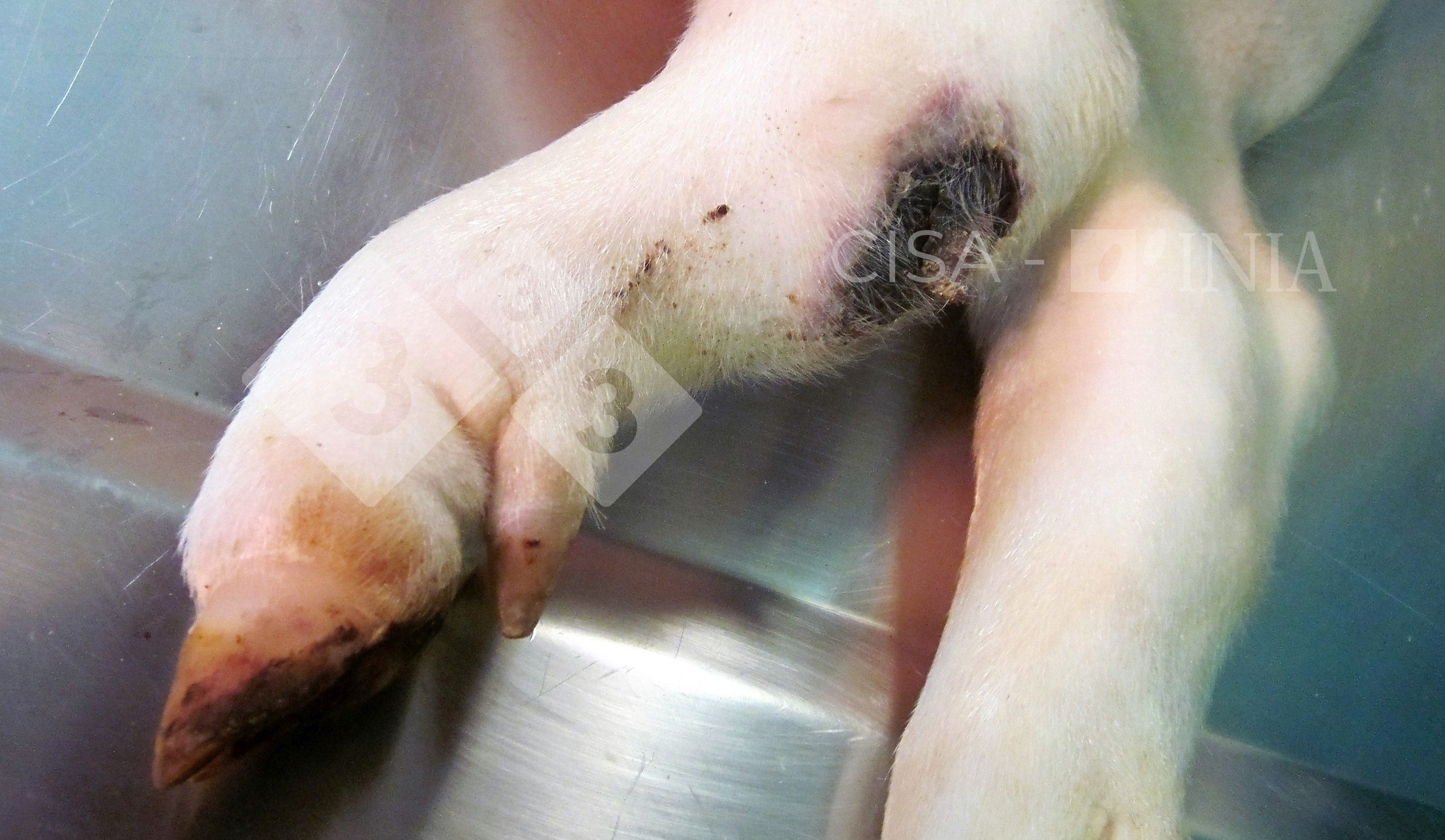 Chronic African Swine Fever clinical picture 35 days after experimental infection. The animal showed recurrent transient fever (>40 Cº) lasting for 20 days and joint swelling (moderate-to-severe) with reddened areas of skin that became raised and necrotic.