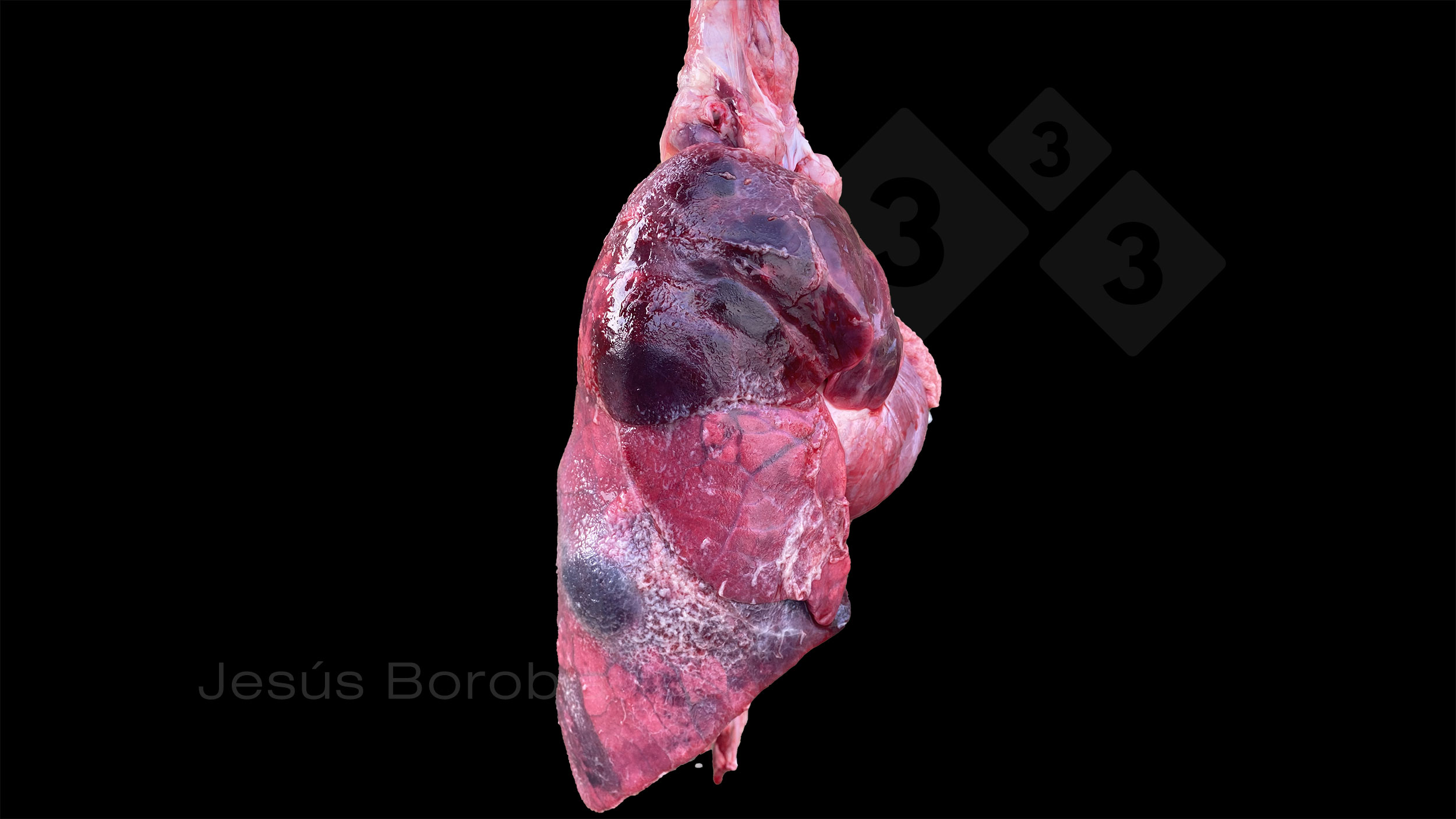This image corresponds to a set of lungs with purple-black hard areas of inflammation, necrosis and haemorrhage with fibrin exudate on the surface of the pleura in a 10 weeks old pig.