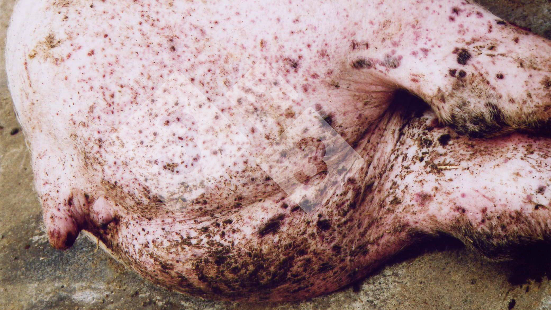 Porcine Circovirus type 2 (PCV-2) infection is almost ubiquitous. PDNS (Porcine Dermatitis and Nephropathy Syndrome) may develop in older pigs where the antibody response has been weak and high levels of virus are present. It is associated with haemorrhages in many organs and has a high mortality rate. The gross lesions on the skin are usually obvious. There is usually gross enlargement of the kidneys which are pale with a granular surface and appear to be petechiated, and haemorrhages can be found on the serous surfaces and in the swollen lymph nodes. The gross lesions must be differentiated from both Swine Fevers.