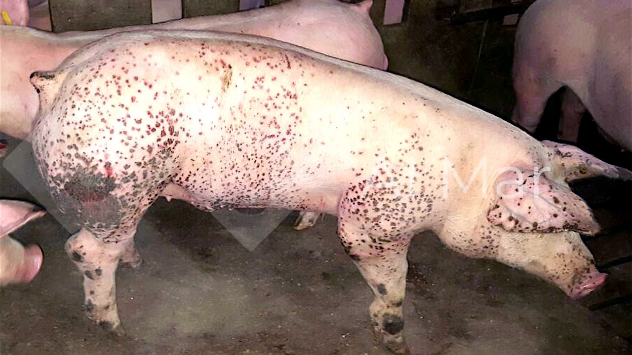 The lesion in the skin of a fattener is a necrotizing haemorrhagic dermatitis, located especially in the perineal area, hind limbs, and milder on the abdomen, forelimbs and ears. The cause of the porcine dermatitis and nephropathy syndrome (PDNS) is related to PCV2.