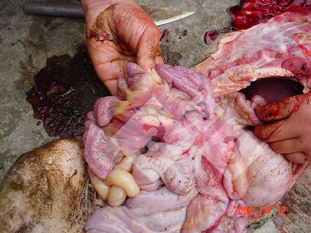 This is tuberculosis in pigs, due to infection with one of the Mycobacterium species, often M avium. The lymph nodes of the neck and intestines of these pigs may be slightly enlarged and firm. The surrounding tissues and the body organs of the pigs often appear relatively normal. The affected nodes have firm grey swelling, with some nodules of various sizes and yellow gritty areas. The types of Mycobacteria that affect pigs are usually the ones found in poultry and birds and from the environment, particularly the soil. The disease is not transmitted between pigs, each individual pig gains the bacterial infection from the environment or interaction with birds. Tuberculosis in pigs is therefore usually seen in smaller farms where the pigs have prolonged access to soil or chickens. On some farms, pigs may have access to infected chicken or wildlife carcase materials presented as feedstuffs. The bacteria are eaten by the pig and settle in the lymph nodes, causing the relatively moderate lesions, usually seen at slaughter. In contrast to tuberculosis in cattle, the types of Mycobacteria and tuberculosis in pigs are not usually considered a threat to humans.