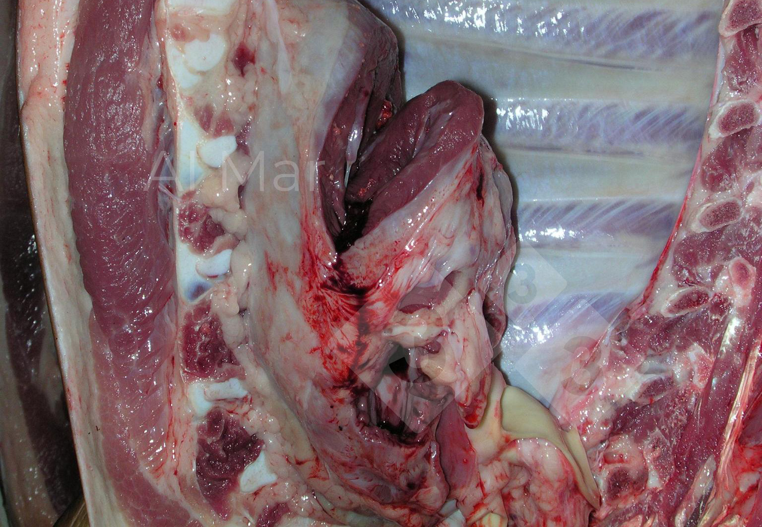The lesion found in the chest cavity of a pig after slaughter is a pericarditis with chronic fibrous pleurisy, ie, pericardial adhesions to the heart and pleura can be seen. Adhesions are very consistent and difficult to separate from the heart and the sternum area, suggesting the injuries are quite old. The cause of these injuries is usually pneumonia, most frequently caused by Haemophilus parasuis and / or Mycoplasma hyorhinis.