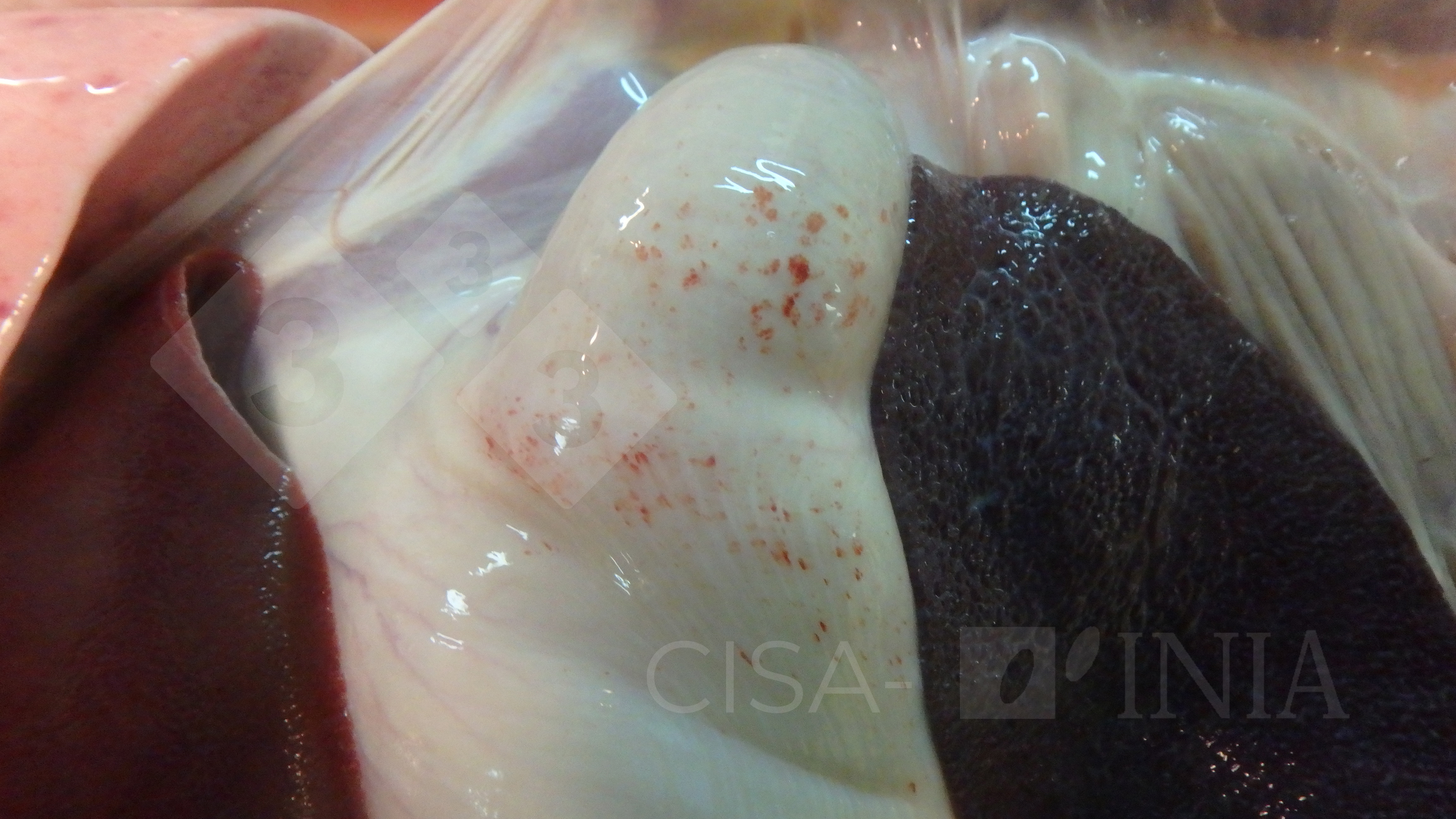 Subacute ASF clinical picture 23 days after experimental infection. Petechias in the fundus of the stomach. Diferential diagnosis should include CSF, different septicemia (Erisipelas, Salmonellosis, Actinobacillus suis), highly virulent PRRS, hemorrhagic diathesis, thrombocytopenic purpura and anticoagulant poisoning.