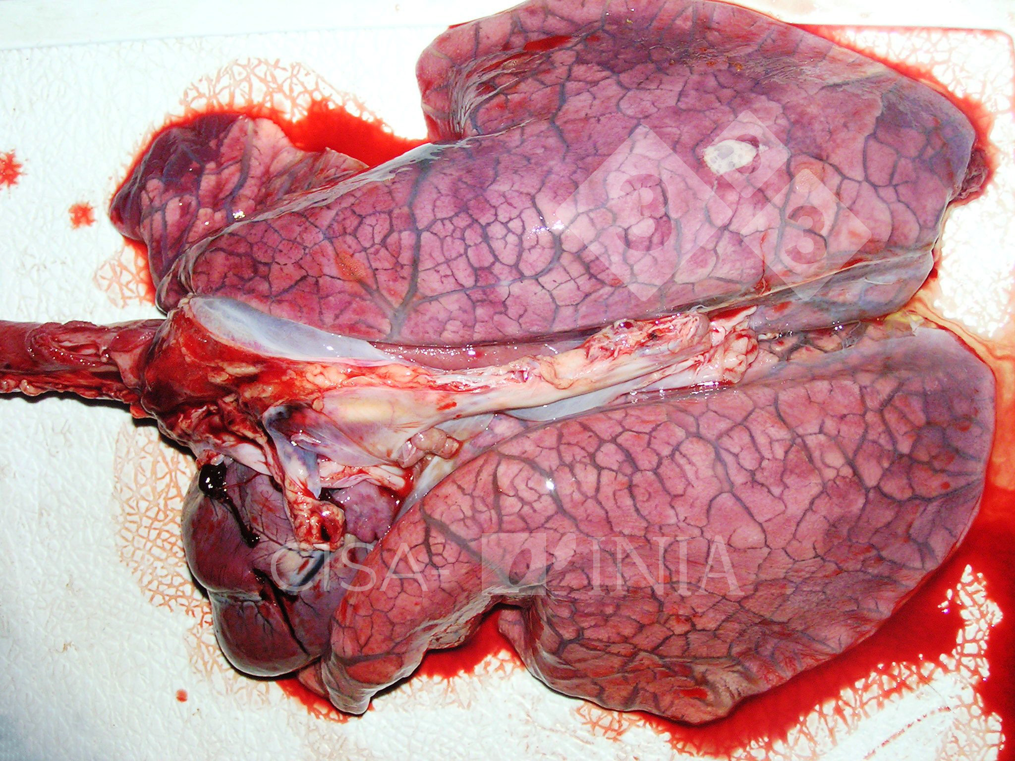 Subacute ASF clinical picture 27 days after experimental infection. The animal died without any clinical signs like fever, anorexia or ataxia. External postmortem examination showed cyanotic areas in chest and back extremities. Lesions at necropsy were: Pulmonary interstitial and alveolar edema. Abundant frothy trachea. Hydro-torax. Diferential diagnosis should include PRRS, PCVAD, mycotoxins, malnutrition, iron deficincy, sudden death due to shock (acute stomach torsion,..).