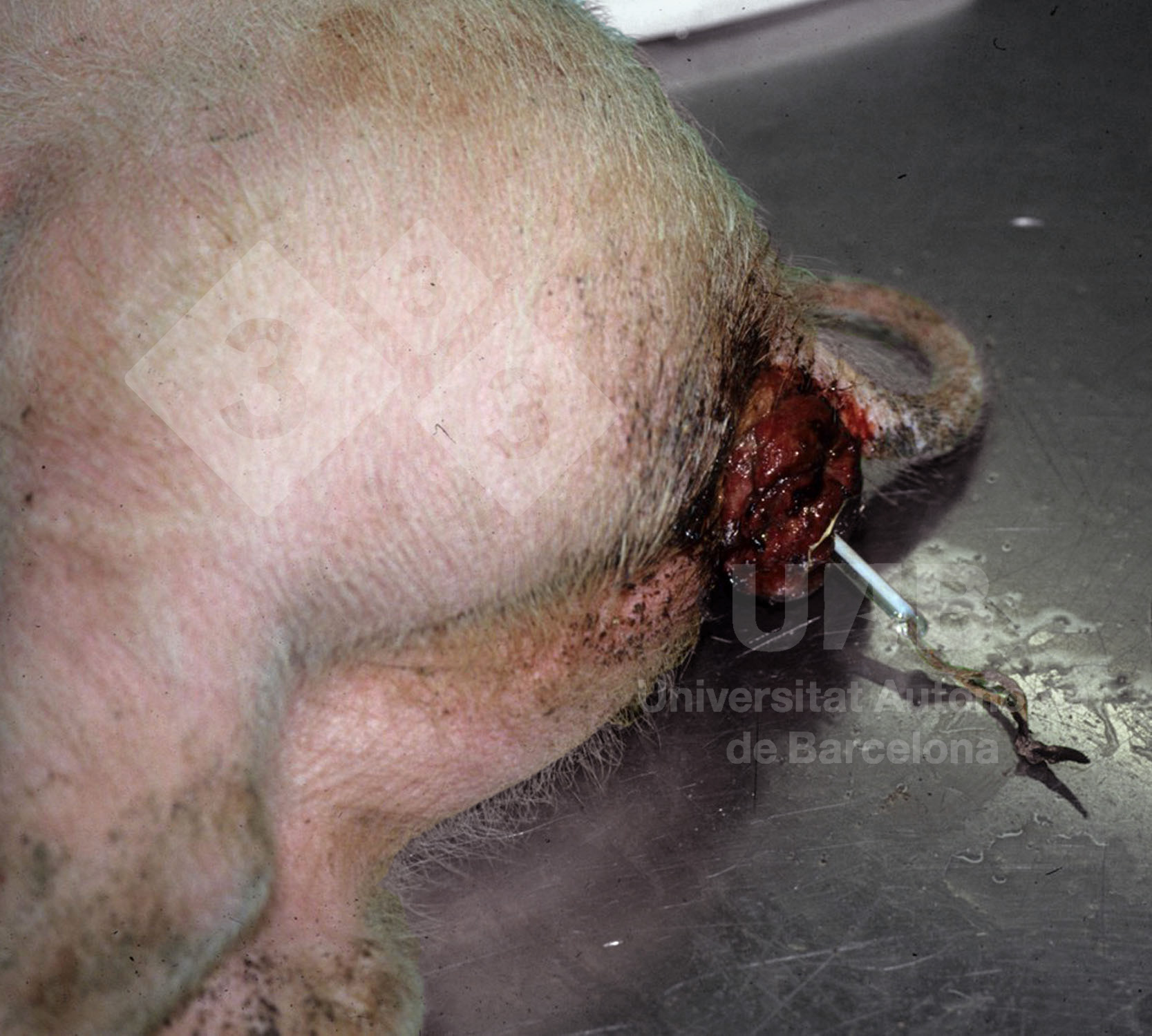 Swine dysentery is produced by <em>Brachyspira hyodysenteriae</em> infection. This bacterium produces a severe mucous and ulcerative colitis. The inflammation and edema of the colon and rectum can be so severe that may produce tenesmus and, consequently, rectal prolapse. However, this lesion can be also a consequence of other diseases such as parasitosis, changes in diet, pregnancy, physical injuries and genetic factors.