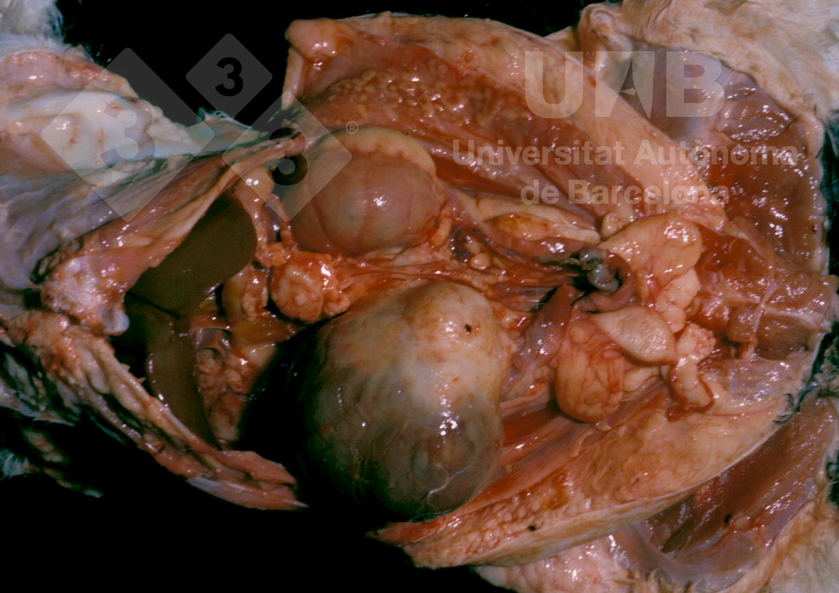 Nephroblastoma is one of the most commonly diagnosed neoplasia of pigs. This enormous, white-and-black mass, affecting left kidney is highly suggestive of tumor.