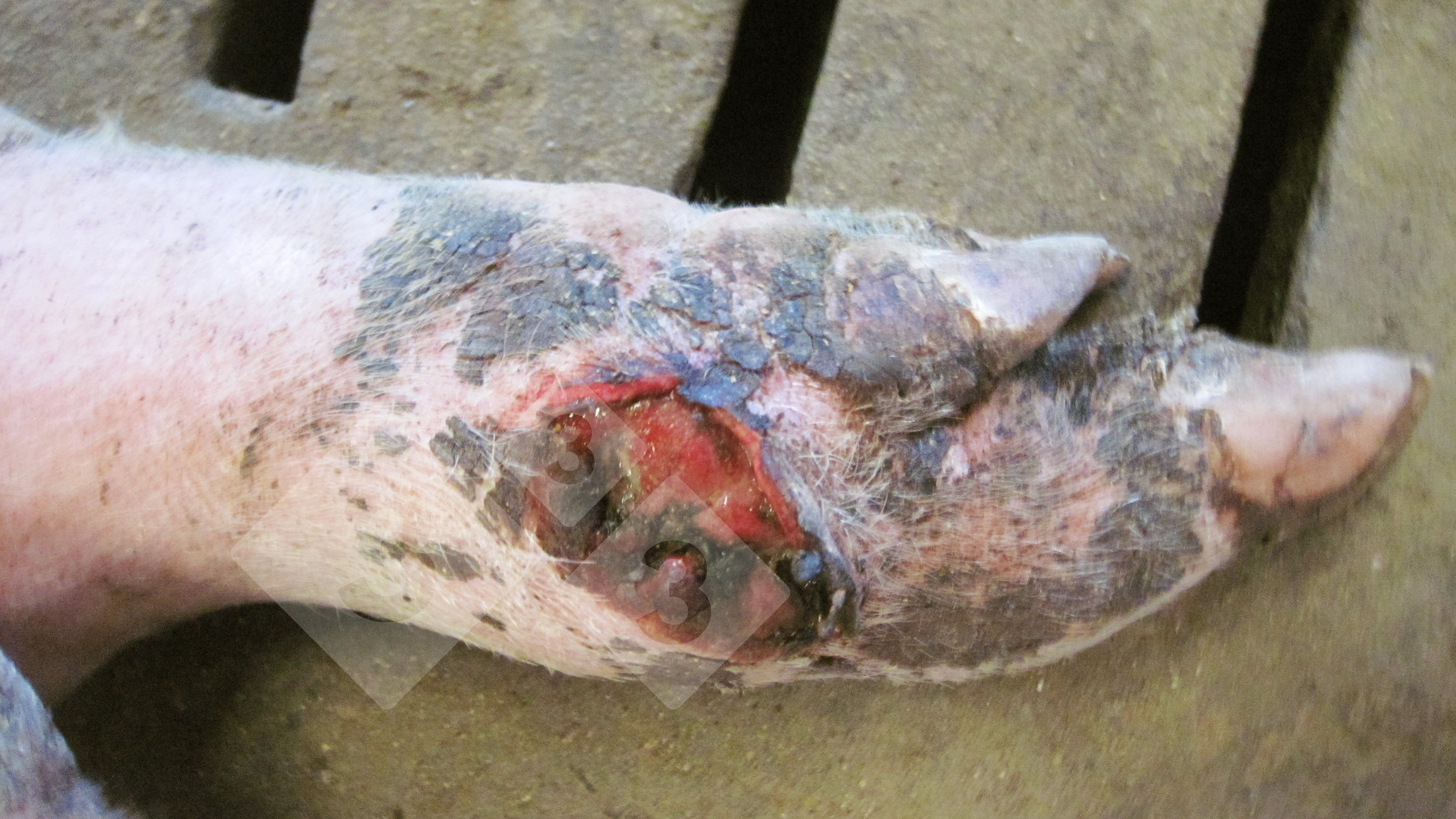 This lesion is suggestive of an abscess inside the foot of the pig – this is also known as septic laminitis or bush foot. Over a week or so, the affected foot becomes noticeably larger and hot and painful. The swollen foot and hoof eventually forms a dry abscess and bloody ulcers just above the hoof. Affected sows often remain lame, do not eat properly and are usually culled. This can be a common problem in some farms, where larger, heavy pigs may stand their hoof in dirty areas of manure in pens. If there is any crack or opening in a toe in the foot, then this leads to contamination of the inner part of the toe hoof with bacteria from the environment. These are not specific bacteria, but a range of E coli and many others present in manure and environmental materials. Once they enter, these bacteria will then grow inside the hoof area and form an abscess, which will swell and burst just above and around the hoof. The condition is more likely where the floors or slats are old and rough, as this will abrade and damage the toes, and so open up foot cracks and openings. Other conditions that may appear similar include foot and mouth disease, physical injury, joint ill.