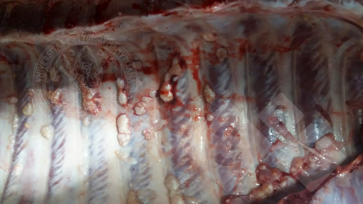 Different sized yellowish-white lesions are seen attached to the inner side of the rib of a fattening pig. These are tuberculous granulomas on the serosal surface. Pigs are susceptible to infection by Mycobacterium bovis, M. tuberculosis and M. avium complex. Lesions can reach these locations by hematogenic or lymphogenic retrograde dissemination.