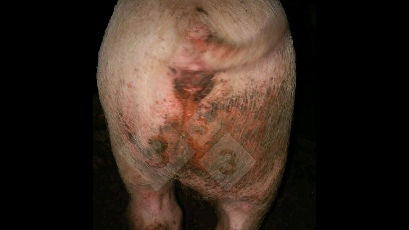 This is the chemical burn after the introduction of pigs to the poorly dried pen, disinfected with a lime. At once, the farmer noticed a reddening of the skin, and after few days, severe skin lesions. Disinfection with lime is a common practice, however proper lime mixing and sufficiently long drying process are crucial to prevent burns of the skin and respiratory tract of introduced animals.